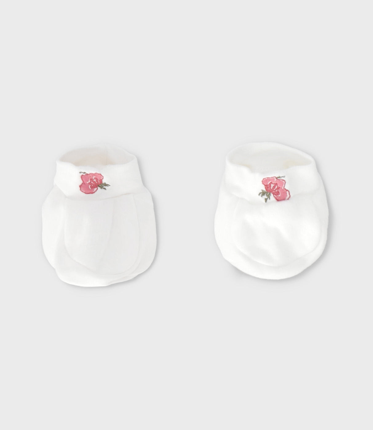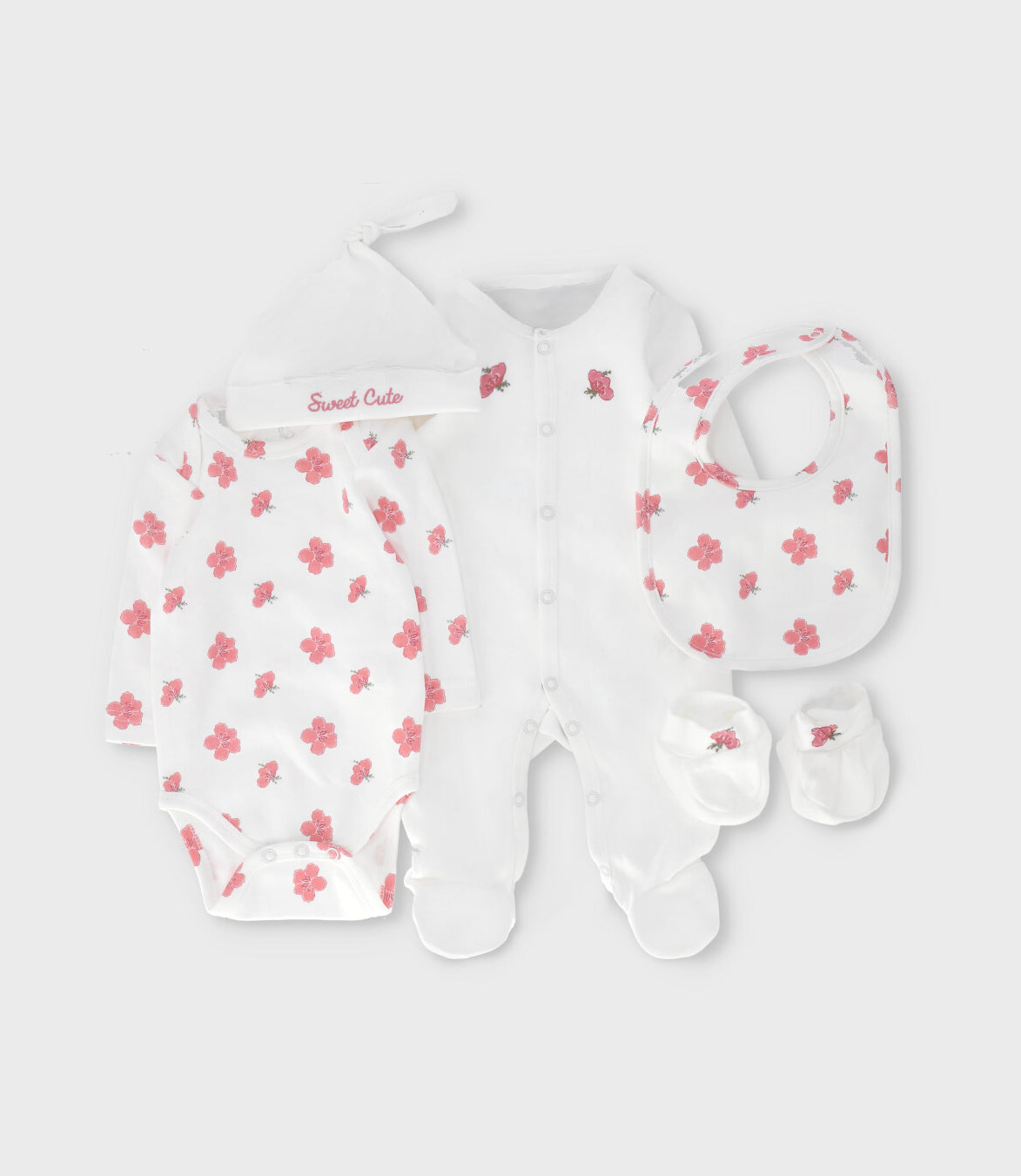 Set general de 5 piezas. Incluye: un enterito, un body, un gorro, un babero y un par de pantuflas.