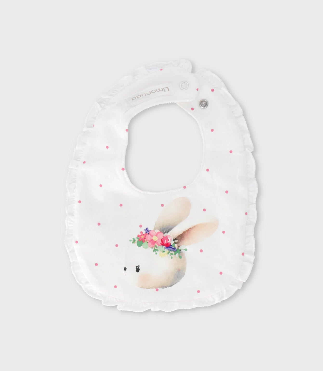 Babero con diseño de conejo para recién nacida. Posee una capa impermeable y la parte trasera es en tela de toalla absorbente. Botones a presión en dos niveles.