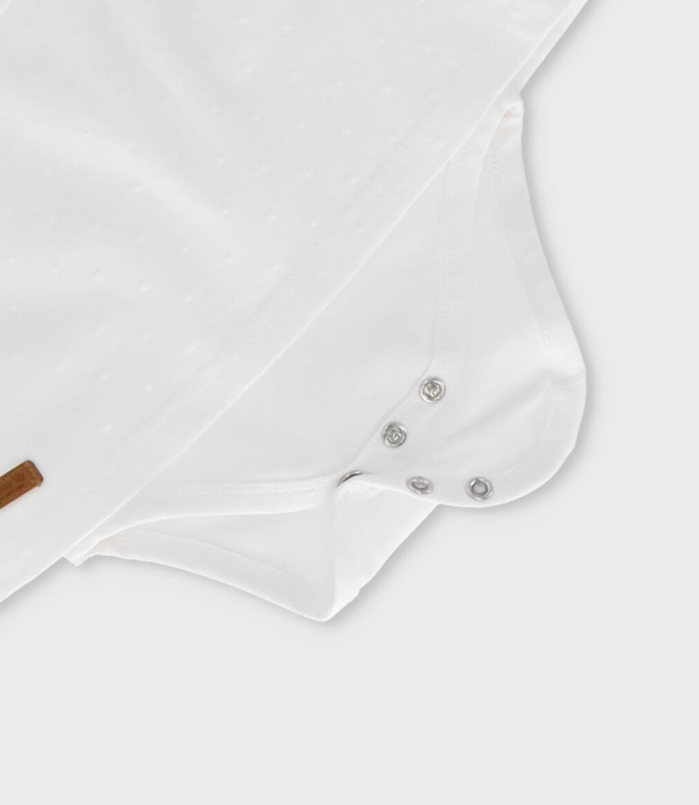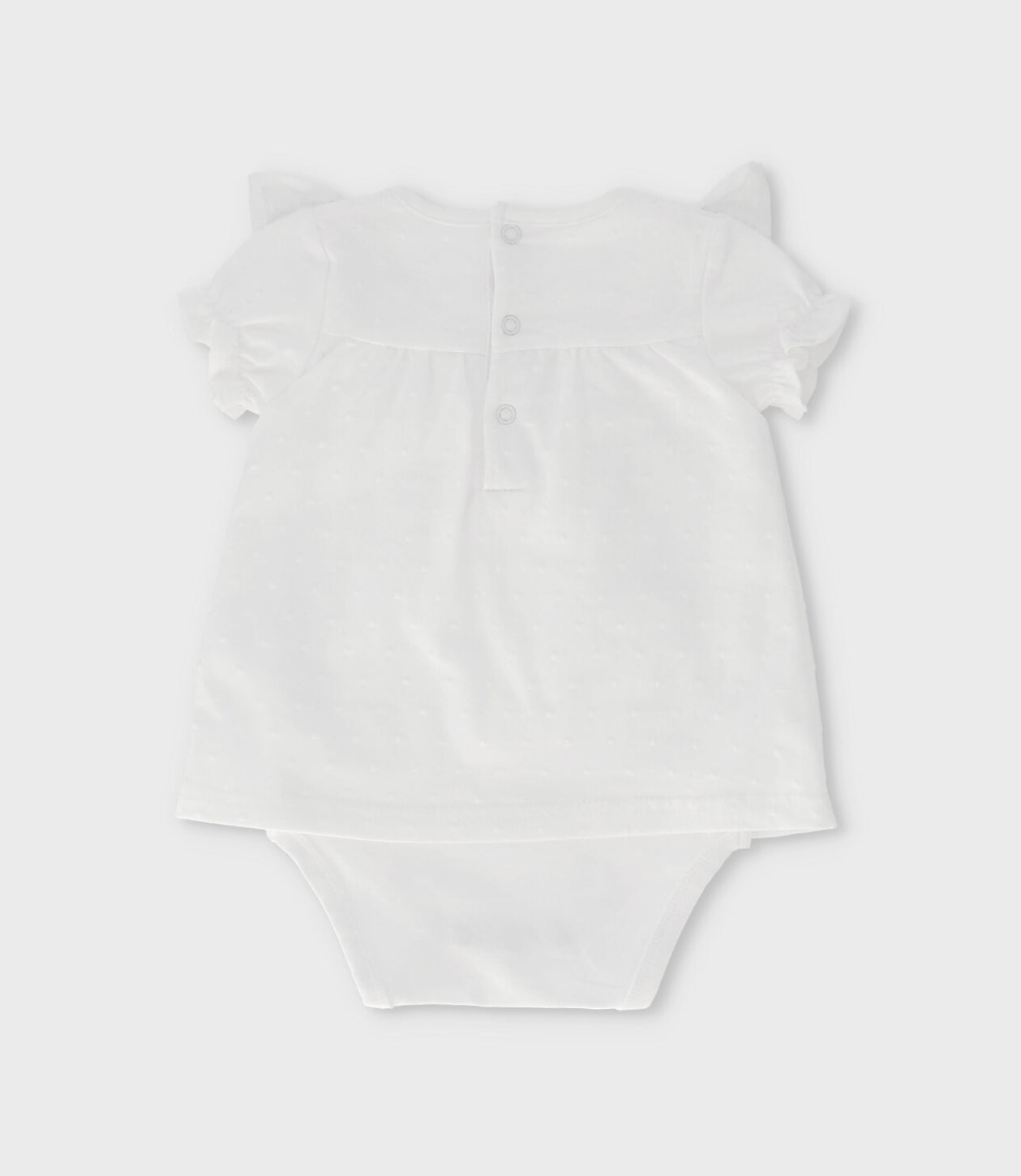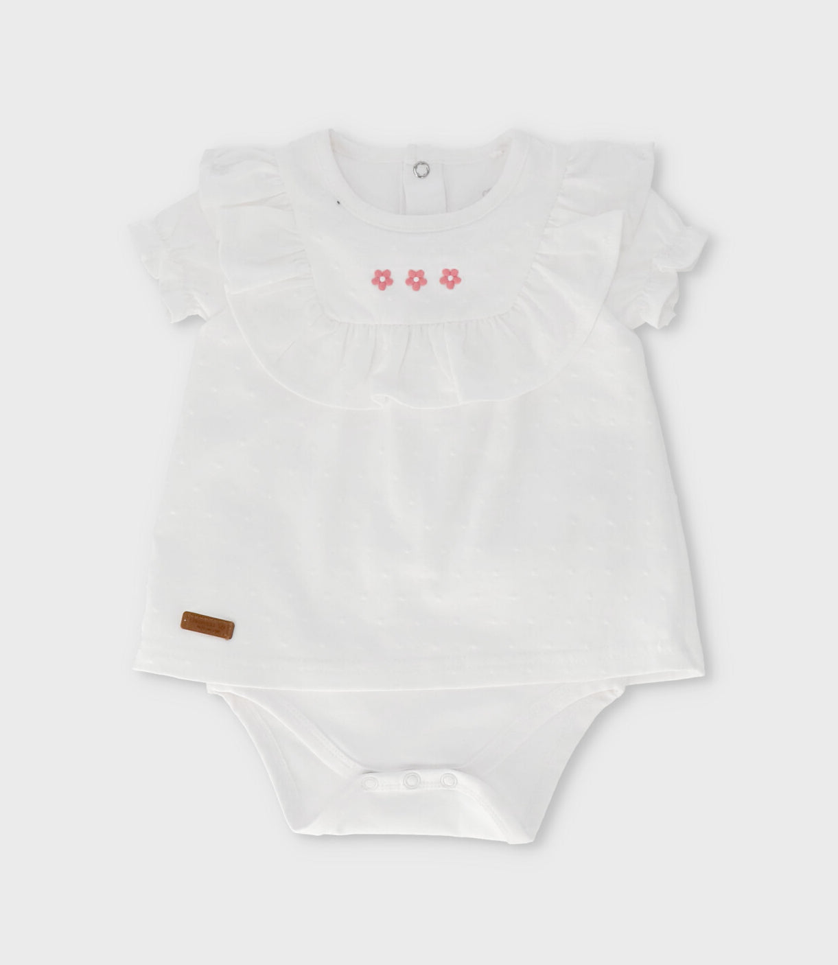 Nuestro body manga corta con vuelos es ideal para acompañar a tu recién nacida en sus primeros días con total comodidad. Confeccionado en jersey y 97% algodón, 3% elastano, su diseño con botones a presión entrega suavidad, libertad de movimiento y practicidad para cambios de ropa. Una prenda básica y funcional que no puede faltar en climas más cálidos.