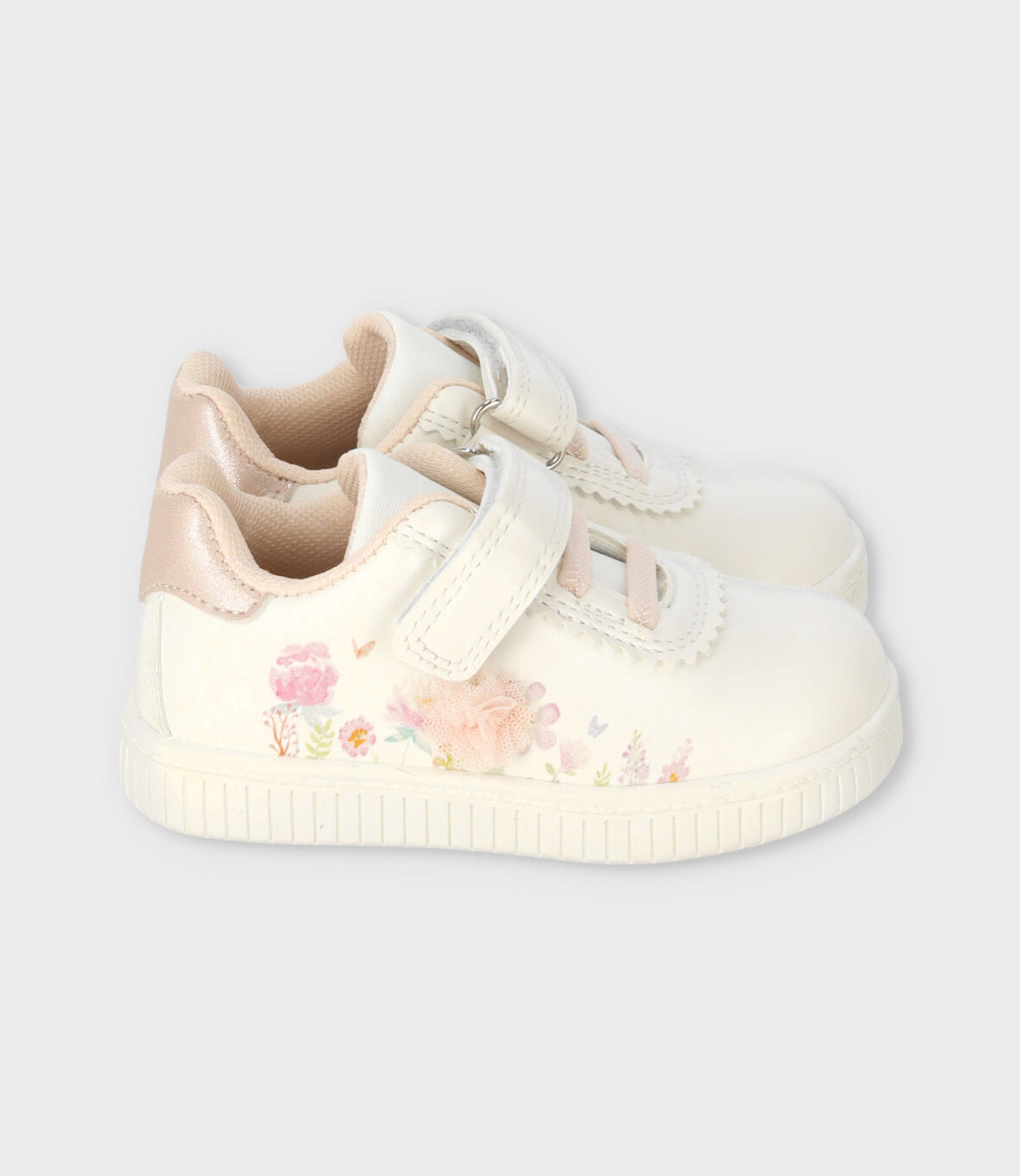 Zapatilla blanca con estampado de flores y una flor decorativa. Apertura con velcro y elástico. Puntera y talón reforzados. Forro de mesh y plantilla preformada. Suela de phylon super blanda.