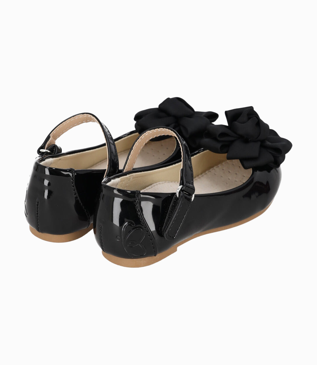 Bailarina de charol negra. Flor textil decorativa en puntera. Apertura con un velcro. Forro de canvas suave. Plantilla de cuero. Suela de TPR.