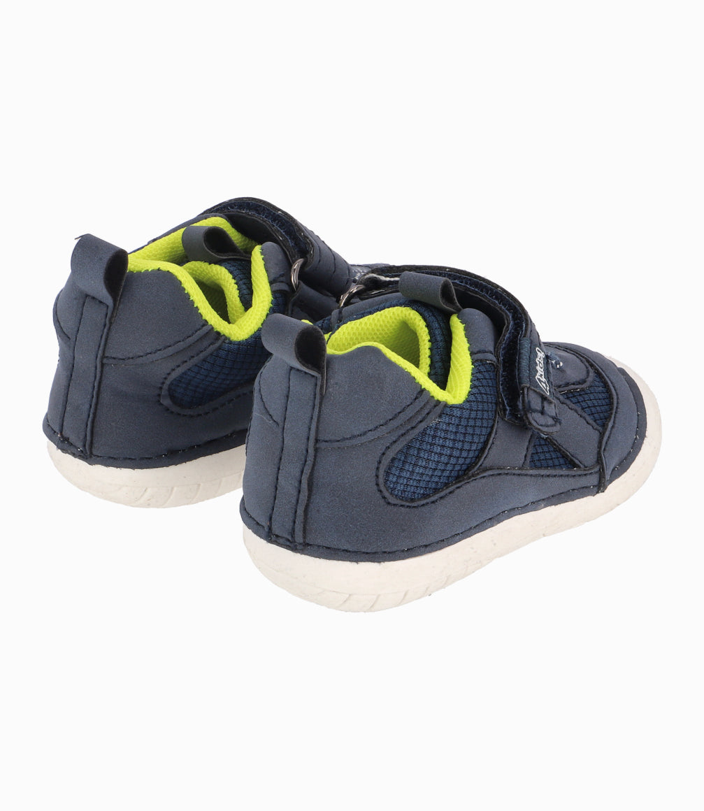 Zapatilla con tira y cordones ajustables. Posee suela antideslizante y puntera redonda.