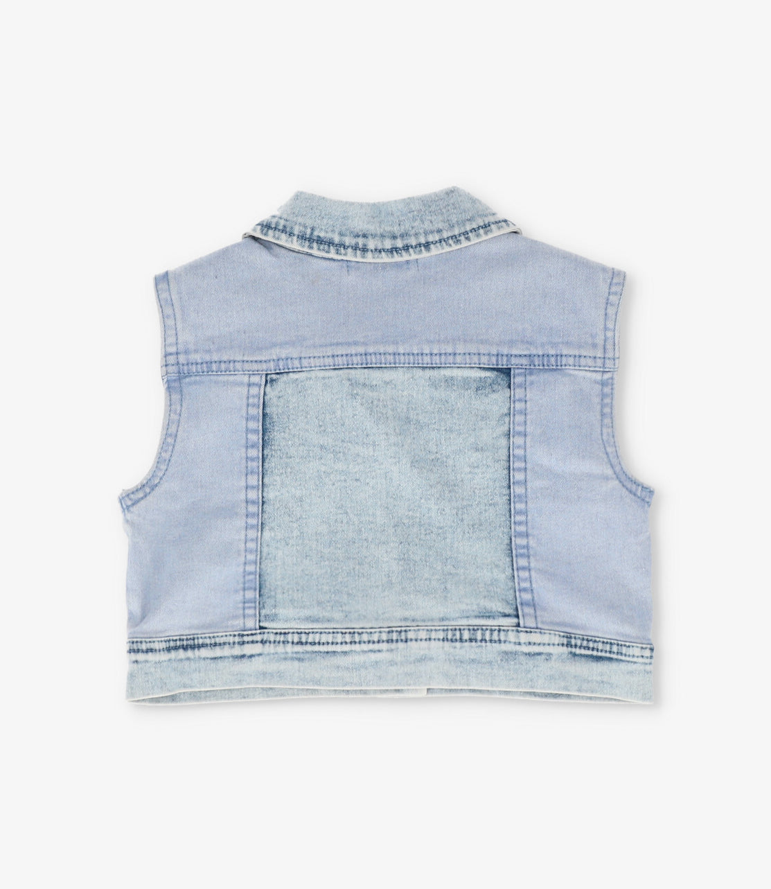 Nuestra chaqueta de denim sin mangas para niña es la prenda ideal para los días en que tu Limo Lover necesita abrigo ligero y mucho estilo. Confeccionada en denim y 73% algodón, 24% poliéster y 3% elastano, combina comodidad y calidez. Su diseño con detalle de lazos, flores y mariposas te ayudará a crear looks increíbles para cualquier ocasión.
