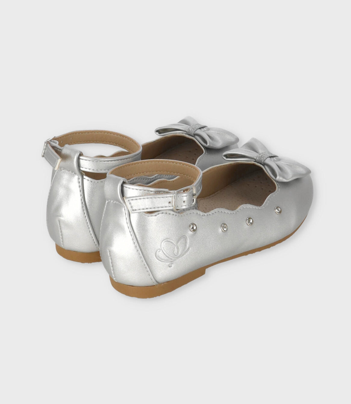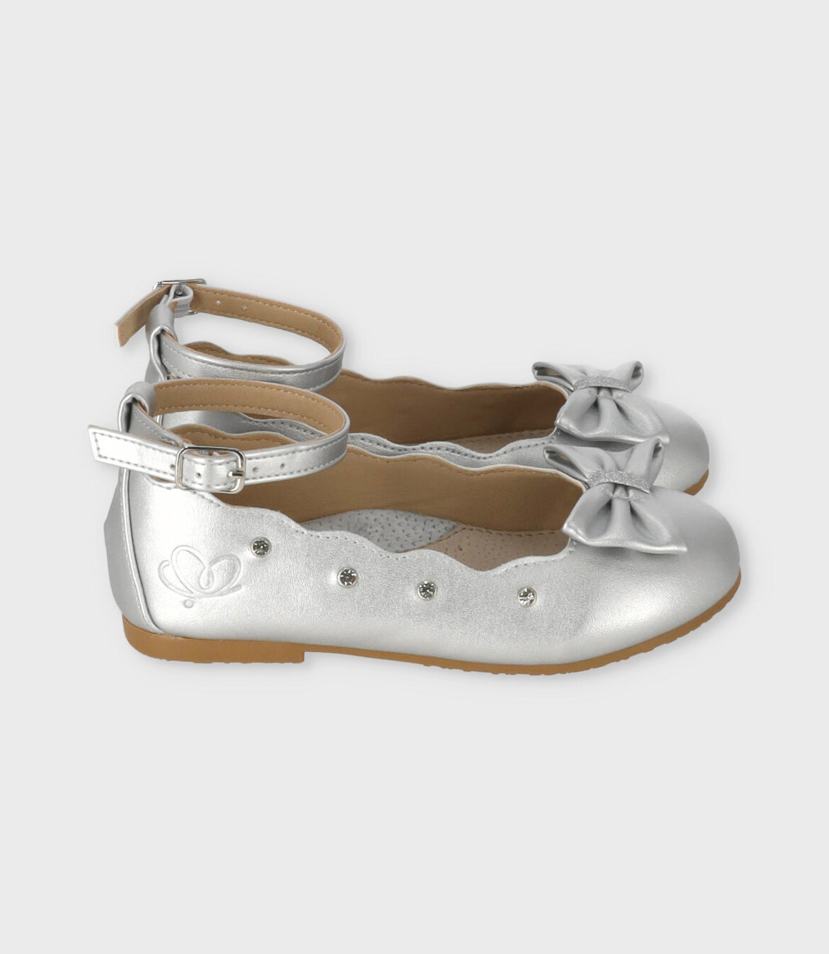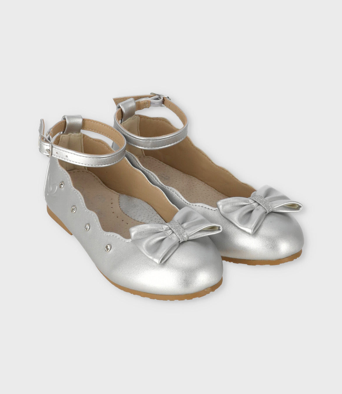 Bailarina de pu plateado. Bordes ondeados y con brillos decorativos. Moño de pu plateado en puntera. Apertura con strap y hebilla en tobillo. Forro de canvas suave. Plantilla de cuero. Suela de TPR.