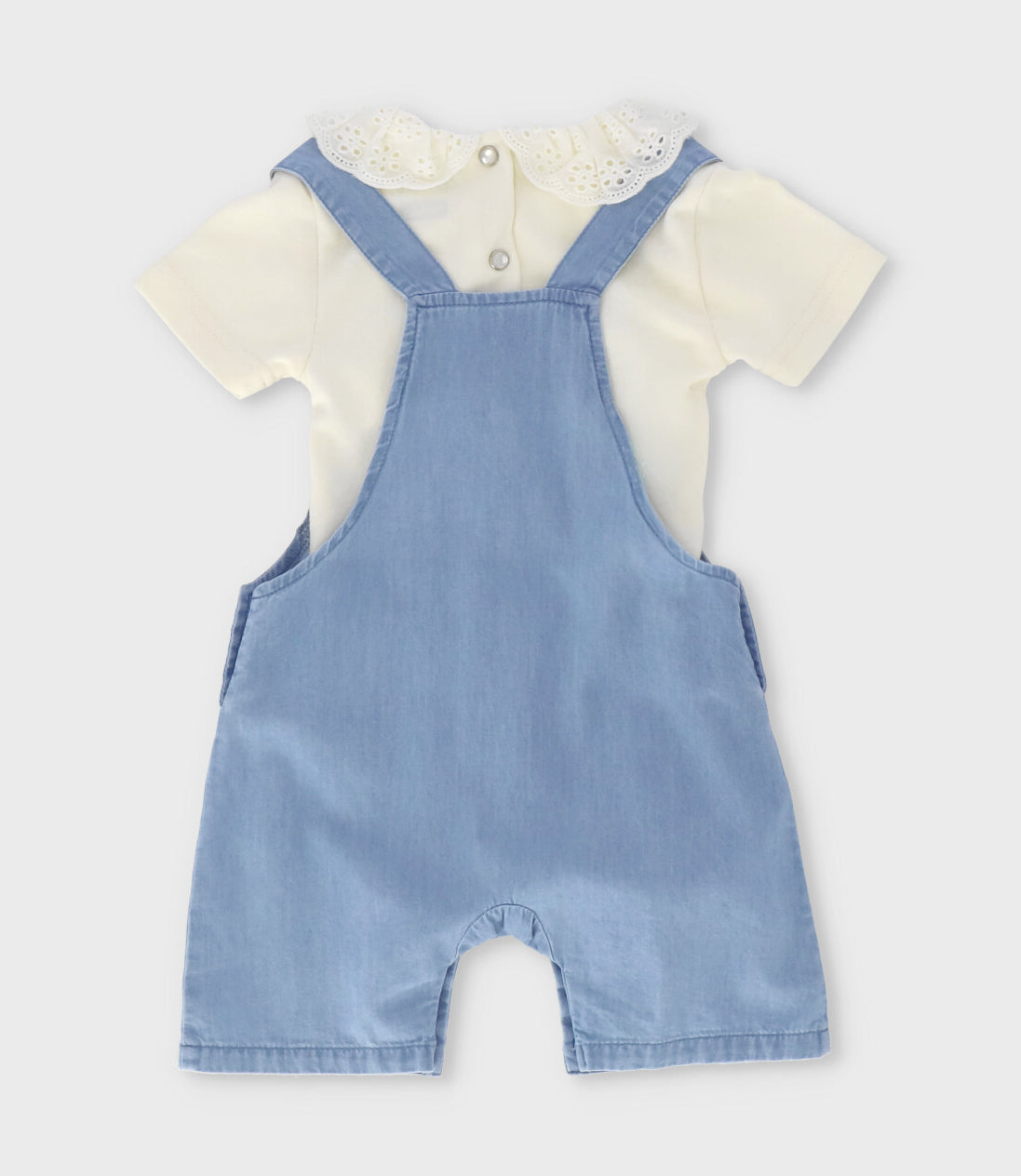 Este conjunto adorable está confeccionado en suave tela interlock y denim, ofreciendo un ajuste cómodo y flexible.