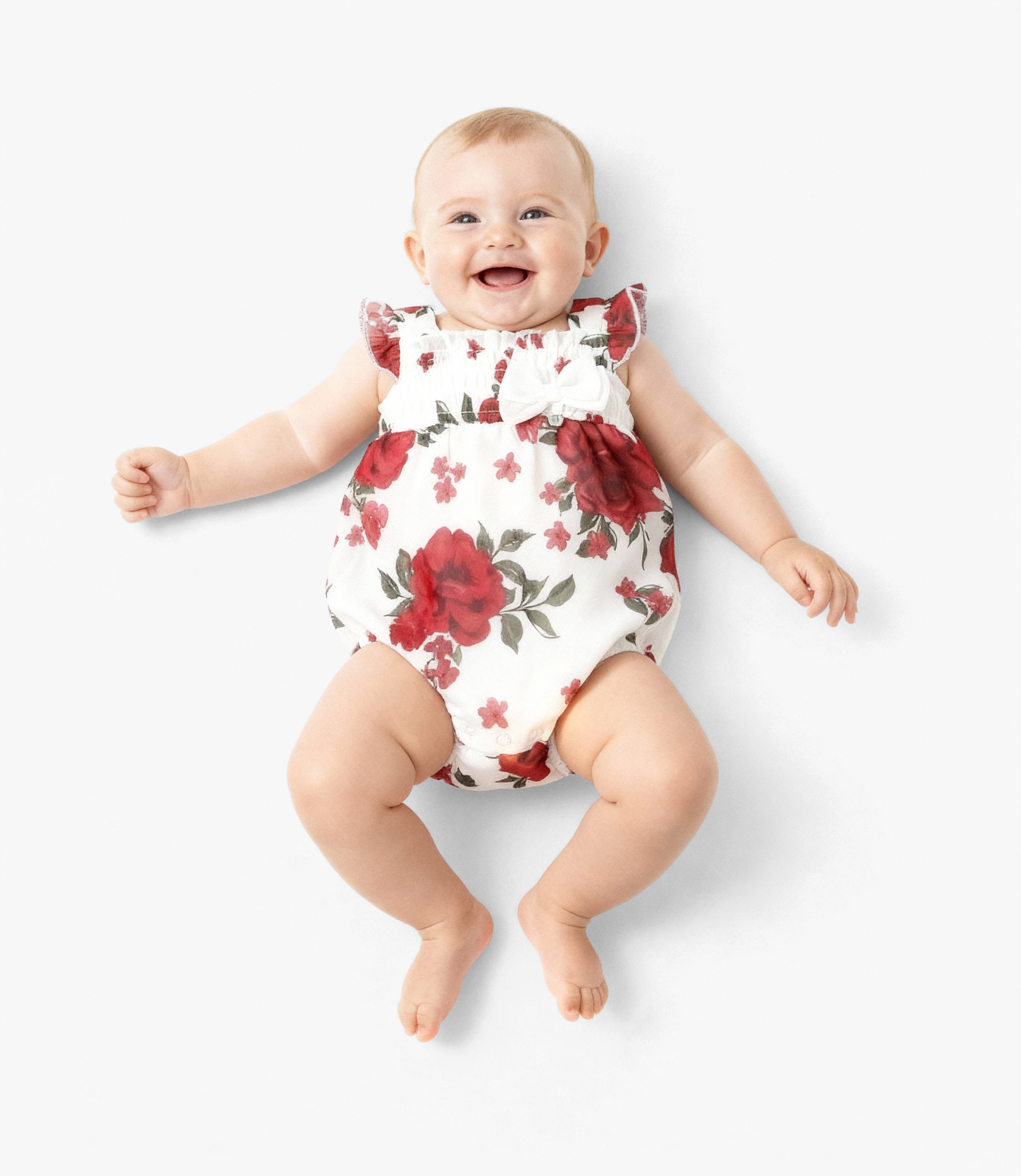 Enterito amplio con diseño floreado, vuelos en los hombros y lazo decorativo. Para mayor comodidad, la parte superior es elasticada.