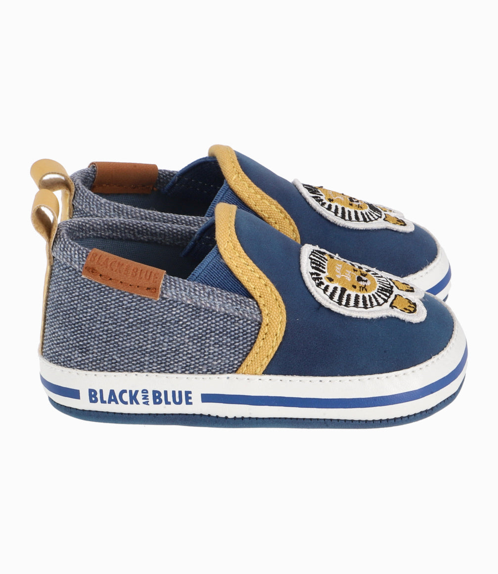 Alpargata denim con parche de león en empeine. Posee suela gruesa y plana.