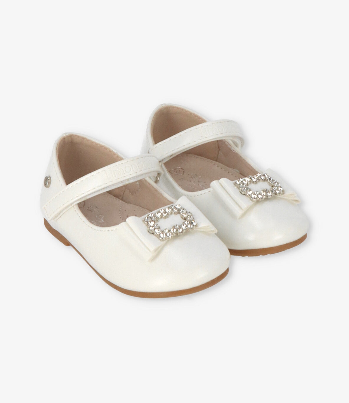 Bailarina de pu crudo con pequeños destellos. Ajuste con velcro. Moño decorativo con hebilla en puntera. Forro de pu suave. Plantilla de cuero. Suela de TPR.
