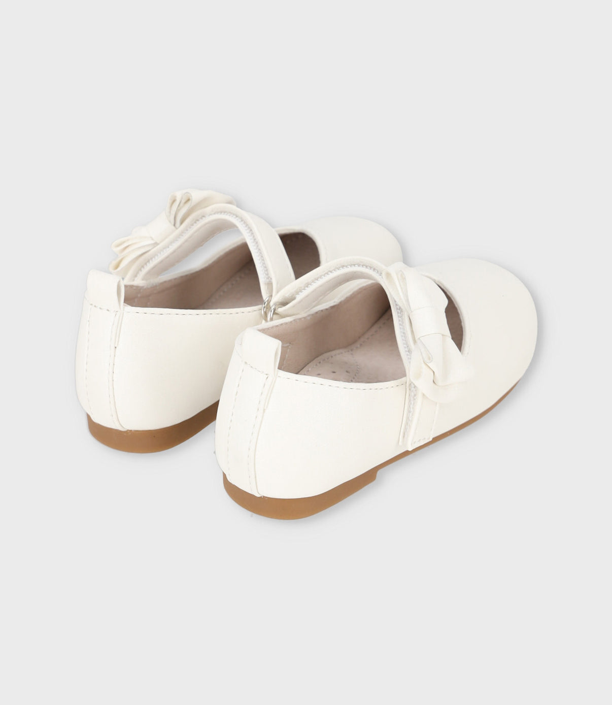 Bailarina de pu blanco con pequeños destellos. Apertura con velcro. Moño decorativo en velcro. Forro de pu suave. Plantilla de cuero. Suela de TPR.