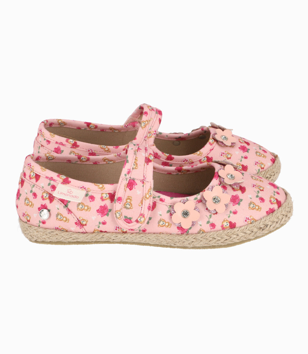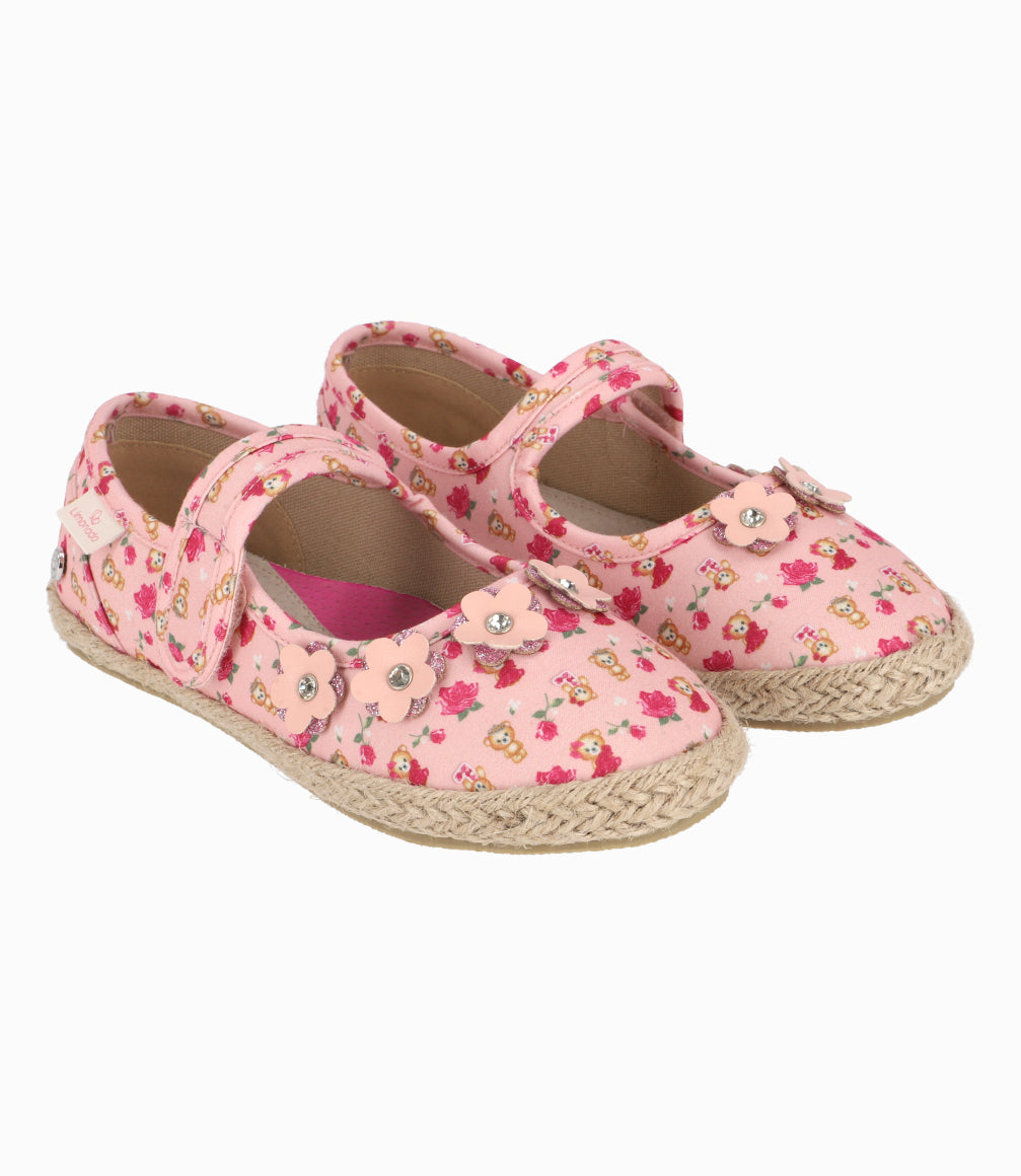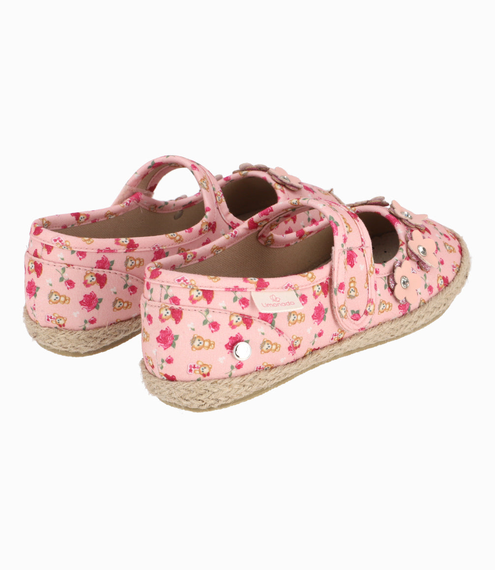 Bailarina con tira ajustable en tobillo. Posee diseño de rosas y ositos en toda la prenda.