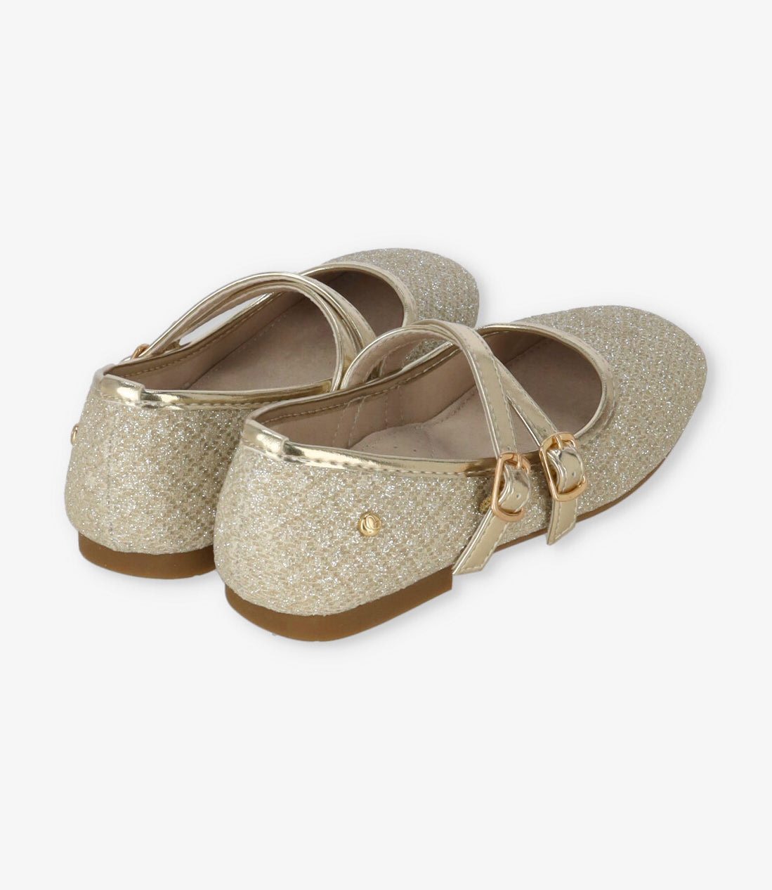Bailarina de pu dorado con glitter. Apertura con doble strap en empeine con ajuste de hebilla. Fotto de pu suave. Plantilla de cuero. Suela de TPR.