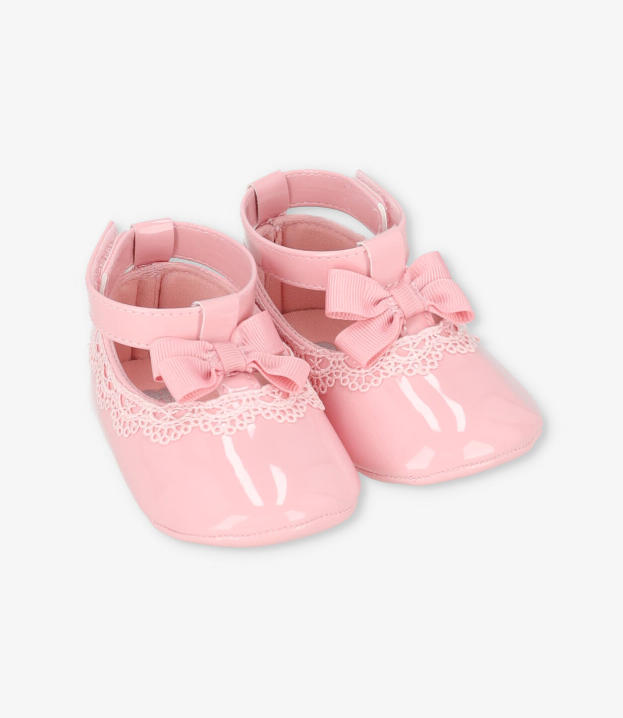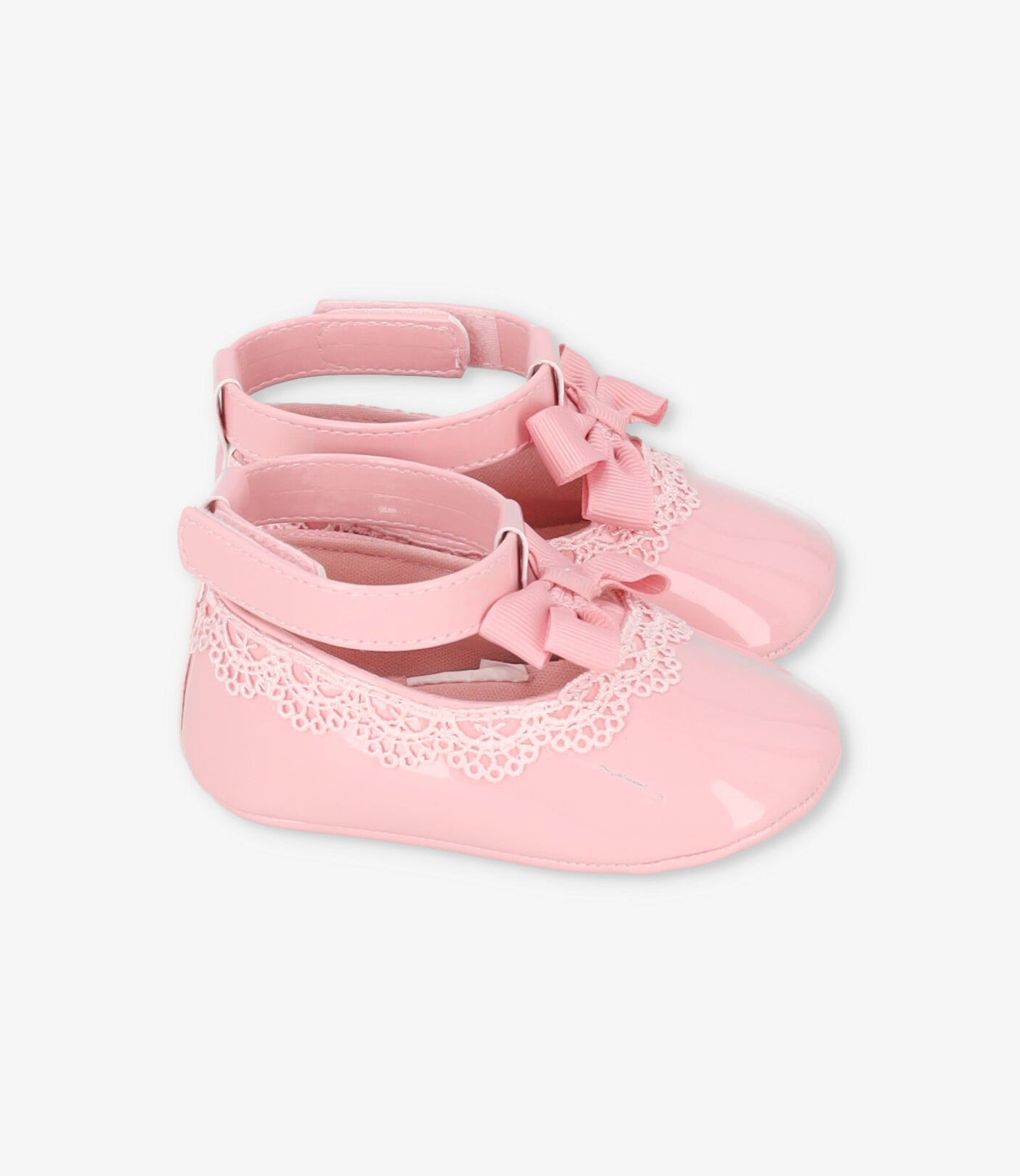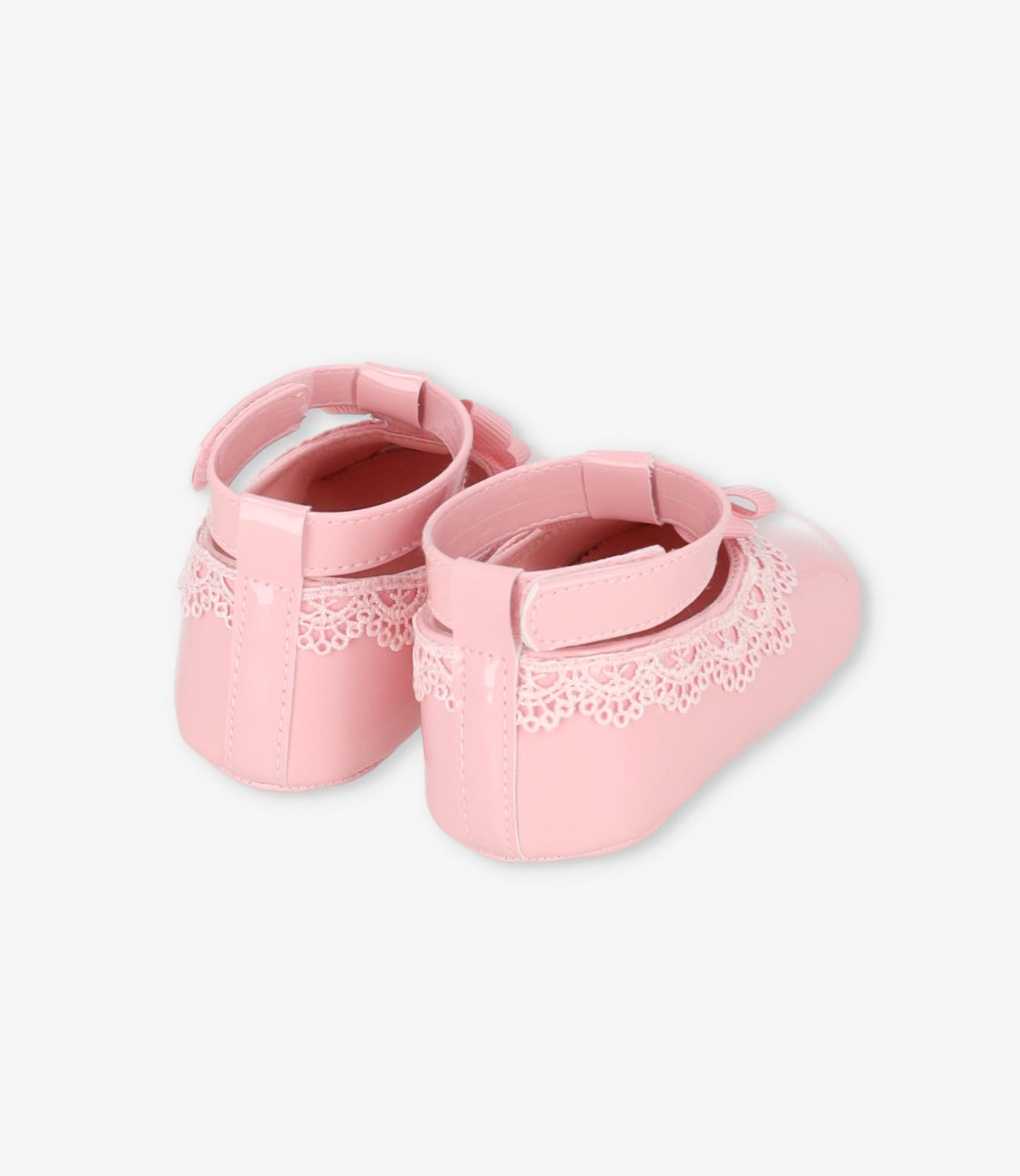 Bailarina de charol rosada con macramé a tono en todo su contorno. Ajuste con velcro en tobillo. Moño decorativo textil en empeine. Forro y plantilla de textil. Pisada de charol con marca bordada.