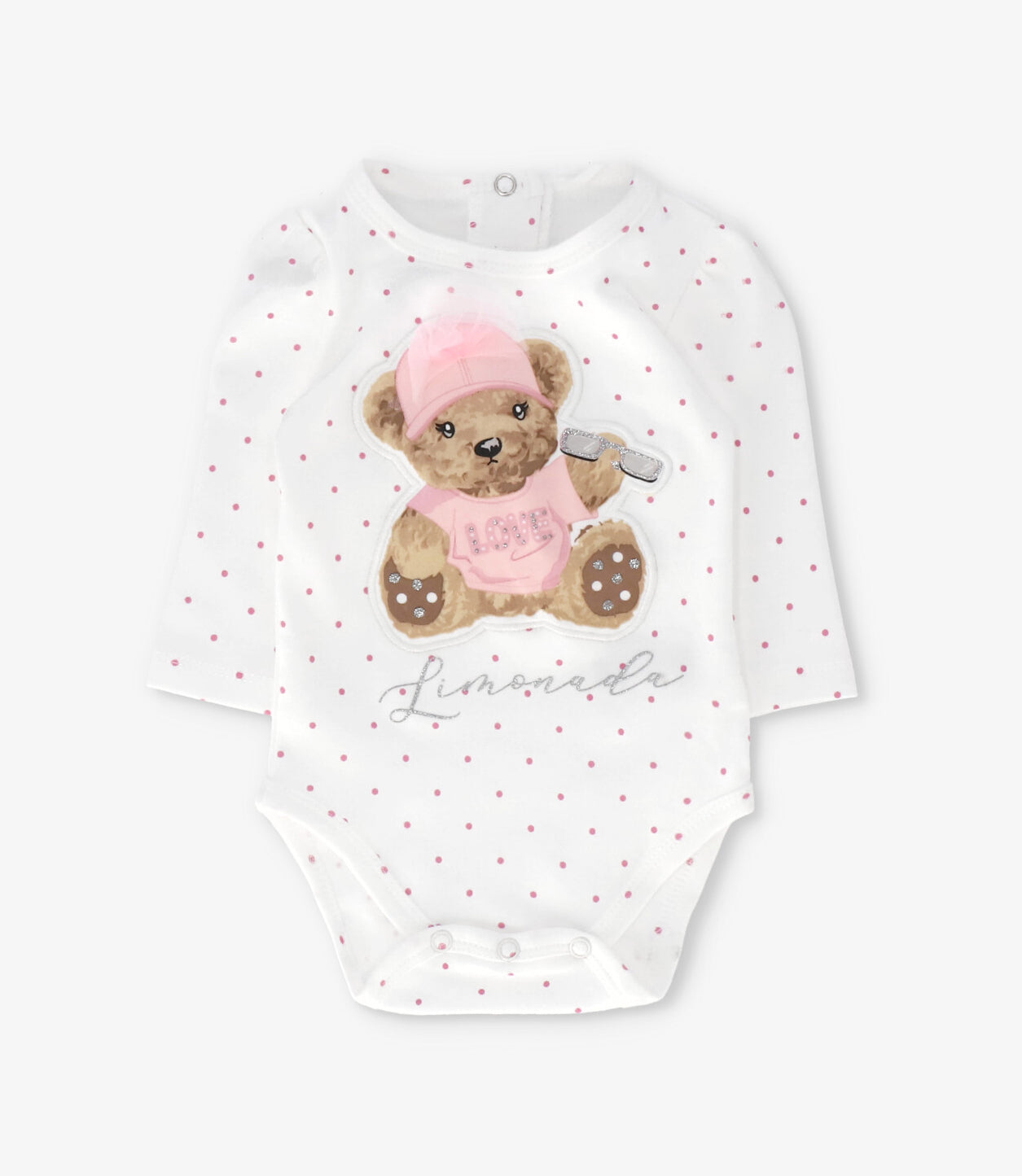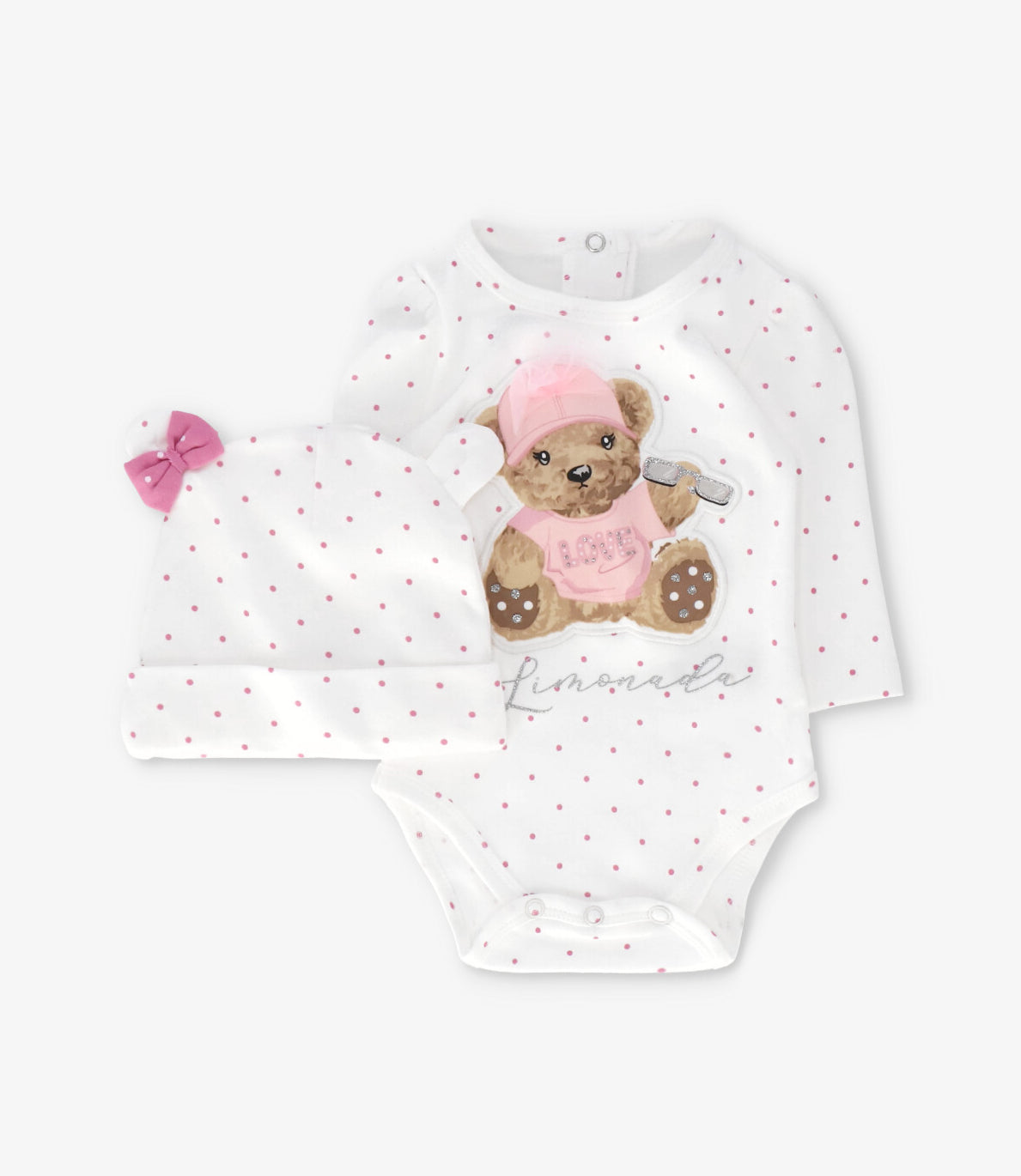 Este body manga larga para recién nacida destaca por su diseño con puntos y oso, confeccionado con una suave composición de 100% algodón. Su gorro le dan un toque único y especial, ideal para acompañar a tu pequeña en los días más frescos con la calidad y dedicación que caracteriza a Limonada.