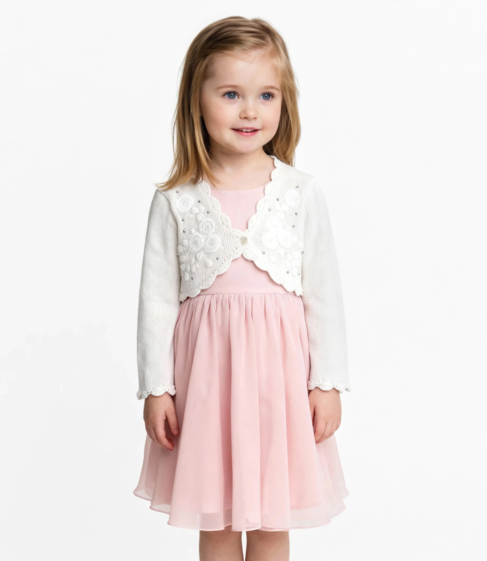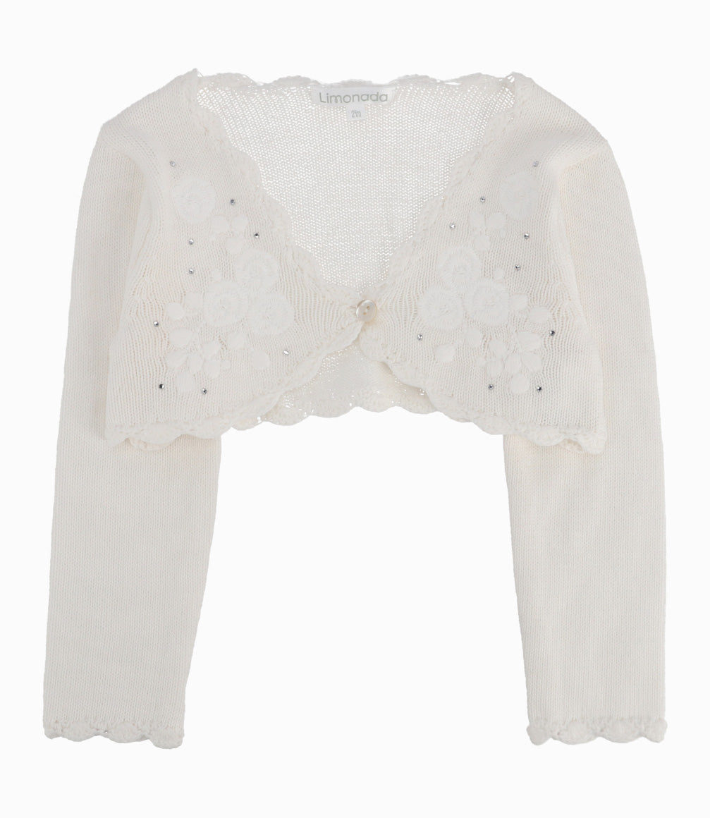 Chaleco corto con bordado de flores y bordes con pequeños vuelos decorativos.