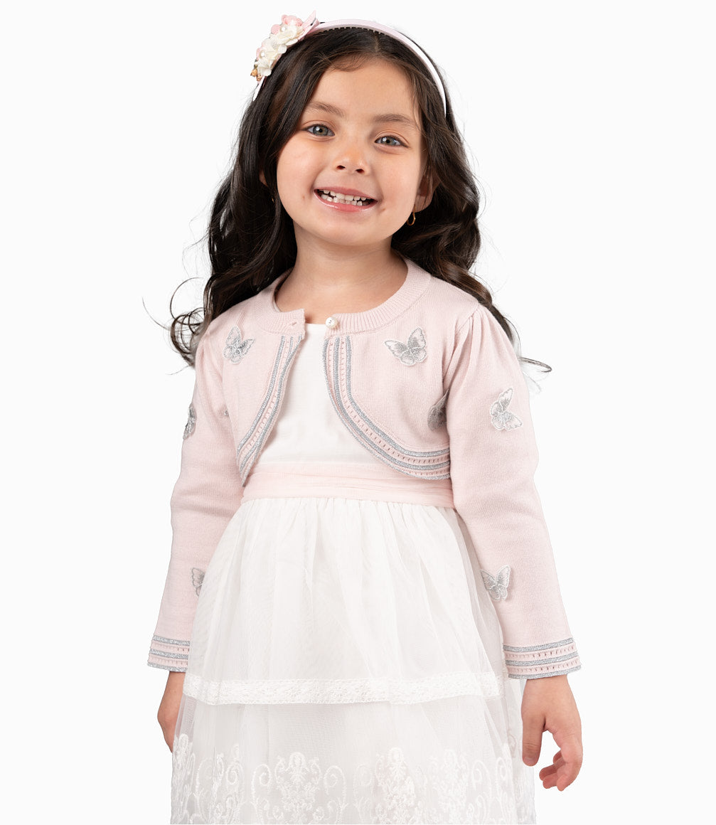 Chaleco estilo bolero con aplicación de parches en relive en forma de mariposa. Posee bordes metalizado en el mismo tono de las mariposas.
