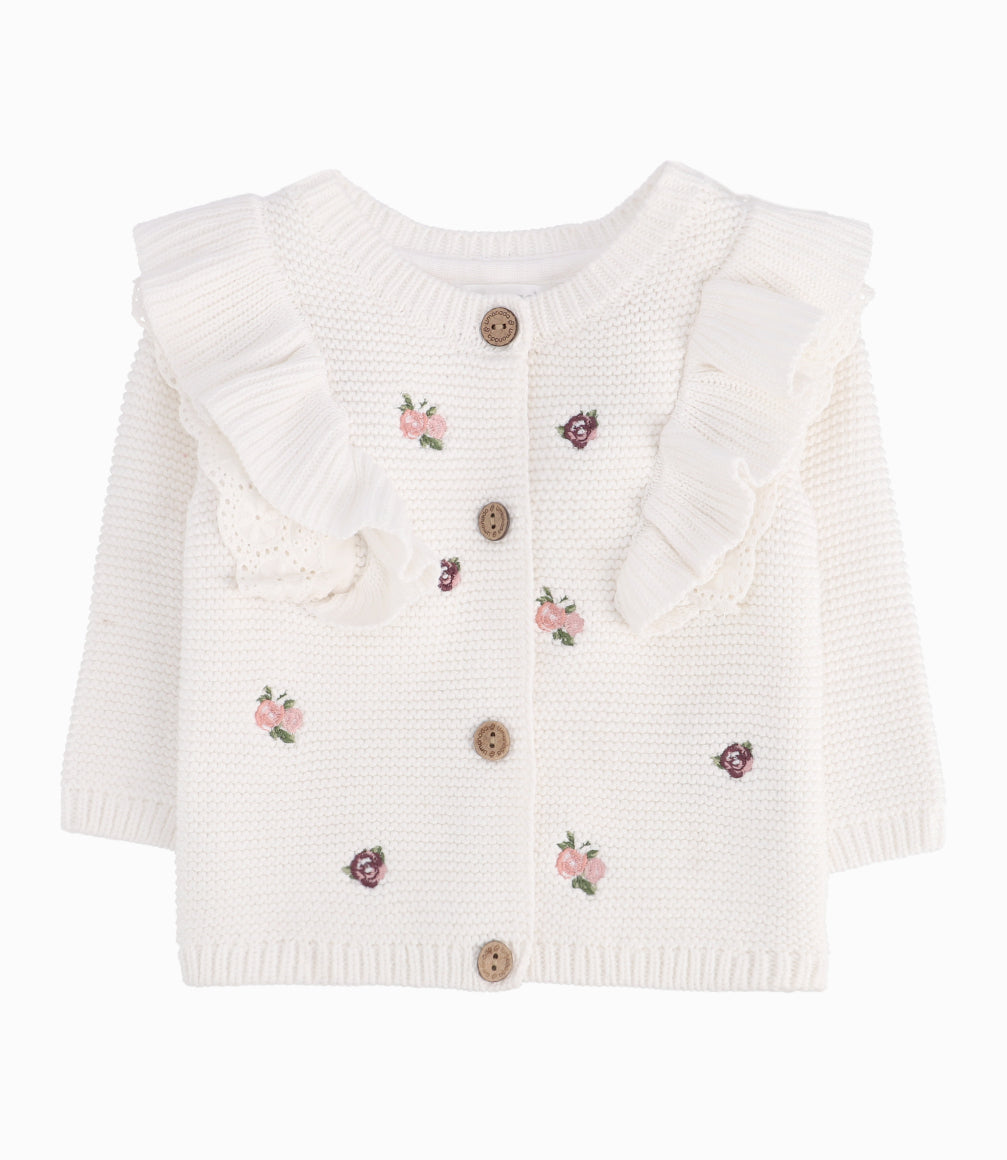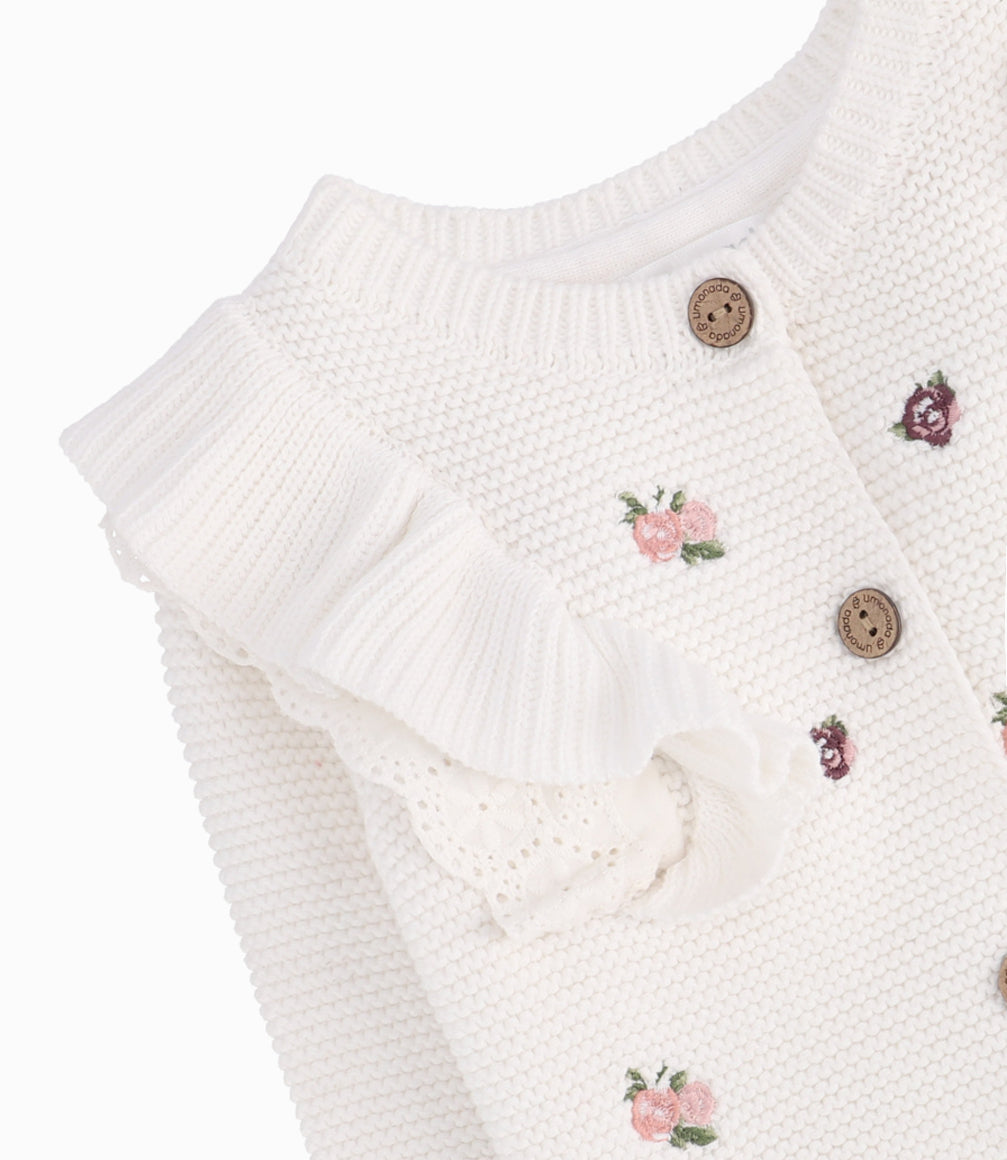 Chaleco tejido trenzado con bordados de flores y vuelos en los hombros.