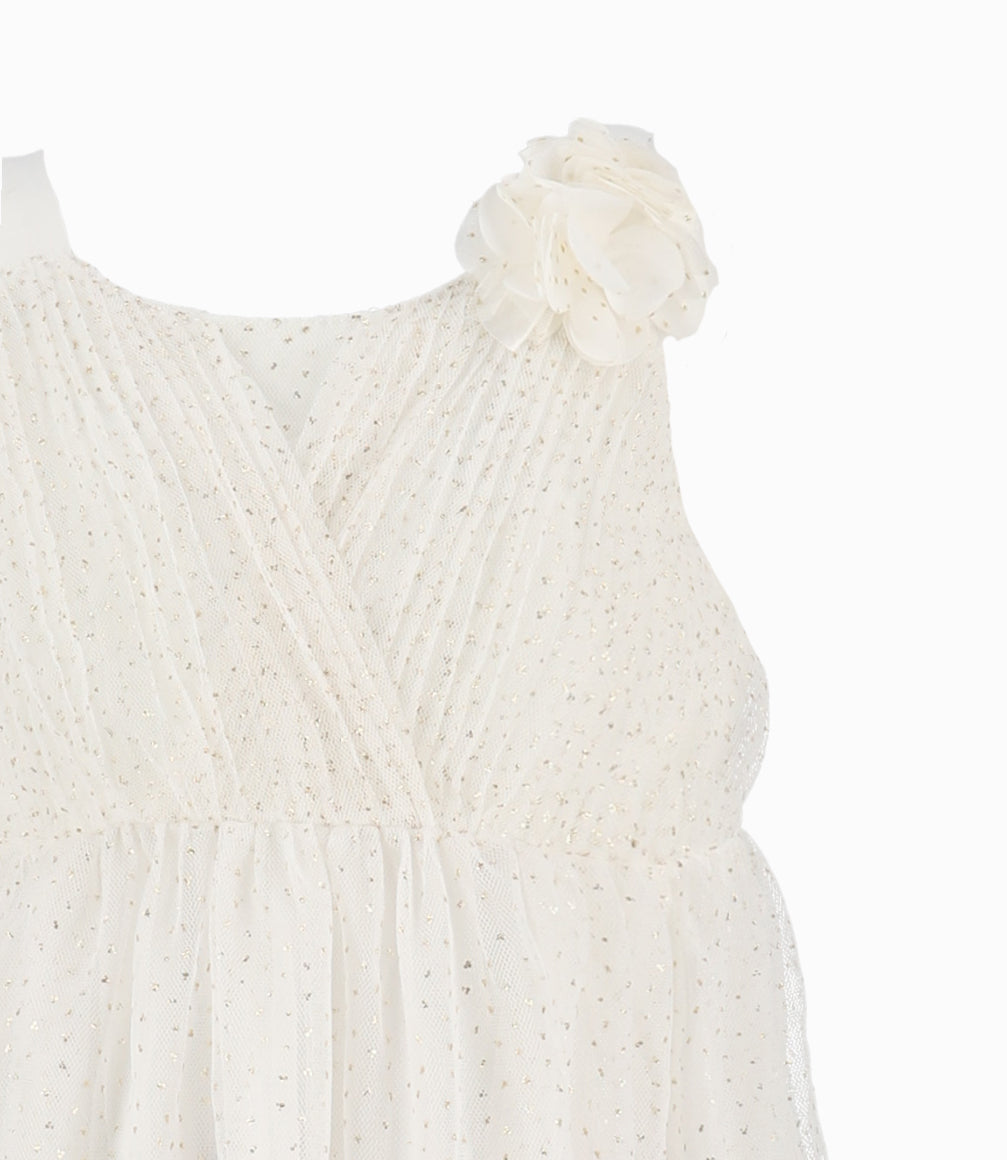 Conjunto: vestido y calzas. Vestido básico de tul con aplicación de flor decorativa. Calza con diseño floral y cintura elasticada.