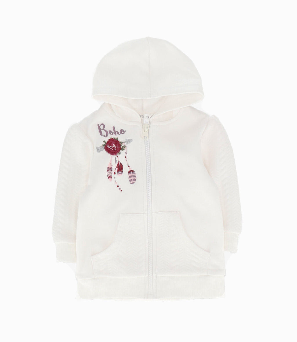 Conjunto buzo: Polerón con gorro con diseño trenzado en los brazos y bolsillos. Posee bordado boho. Pantalón de buzo con diseño floreado y cintura elasticada. Una variable que hace la diferencia en nuestras telas es que tienen una mayor durabilidad y comodidad debido al porcentaje de elastano presente en la composición.