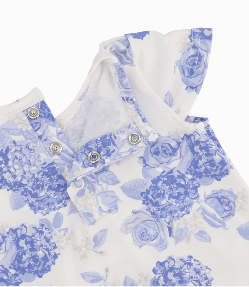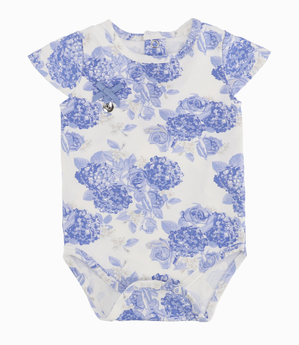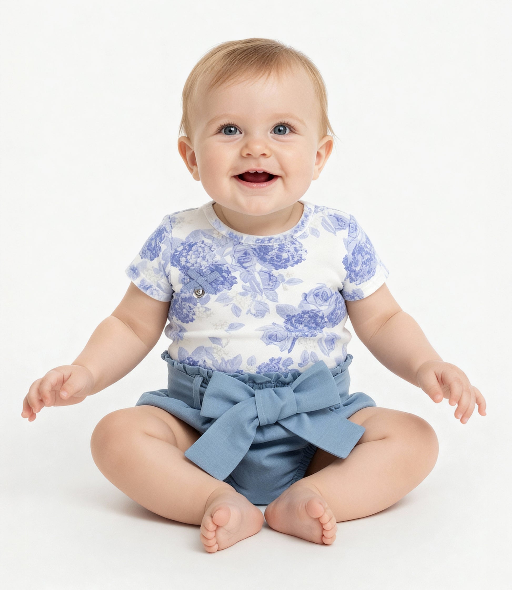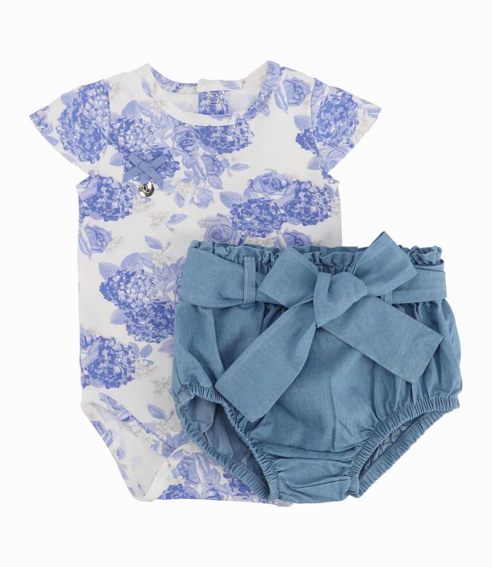 Conjunto: body y calzón. Body manga corta con diseño floreado. Calzón de denim con bordes elasticados y cinturón con lazo.