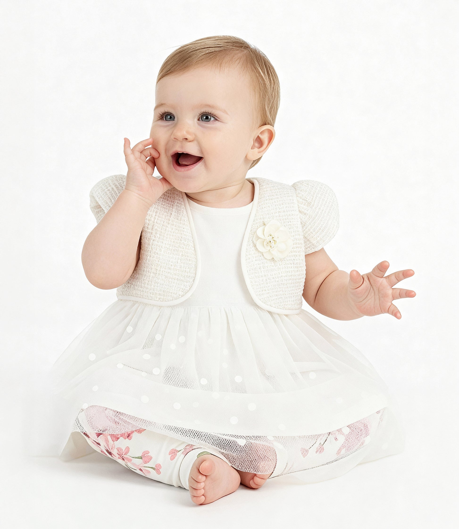 Conjunto: vestido y calzas. Vestido formal de tul con bolero. Calzas con diseño floreado y cintura elasticada.