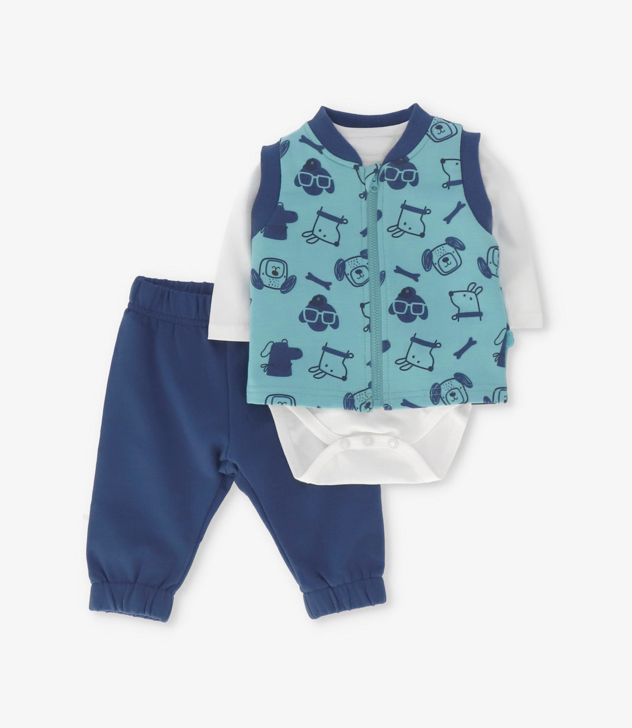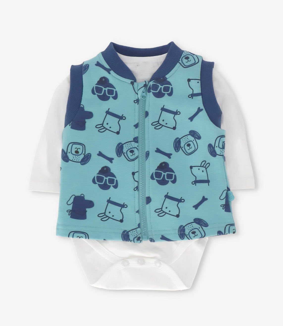 Incluye body manga larga, calzas elasticadas y una chaquetita sin mangas con cierre, ideales para mantener al bebé abrigado y cómodo en todo momento.