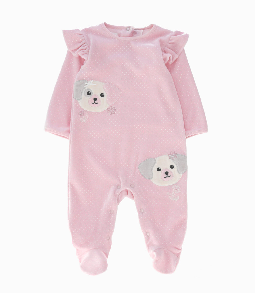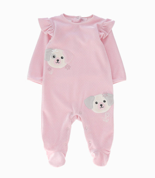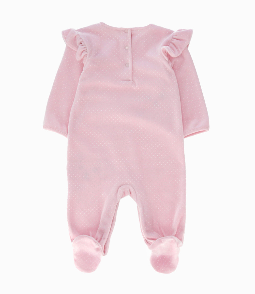 Este enterito con vuelos, elaborado con tela terciopelo y una composición de 80% algodón y 20% poliéster, está pensado para vestir a tu bebé con suavidad y delicadeza durante todo el día.
