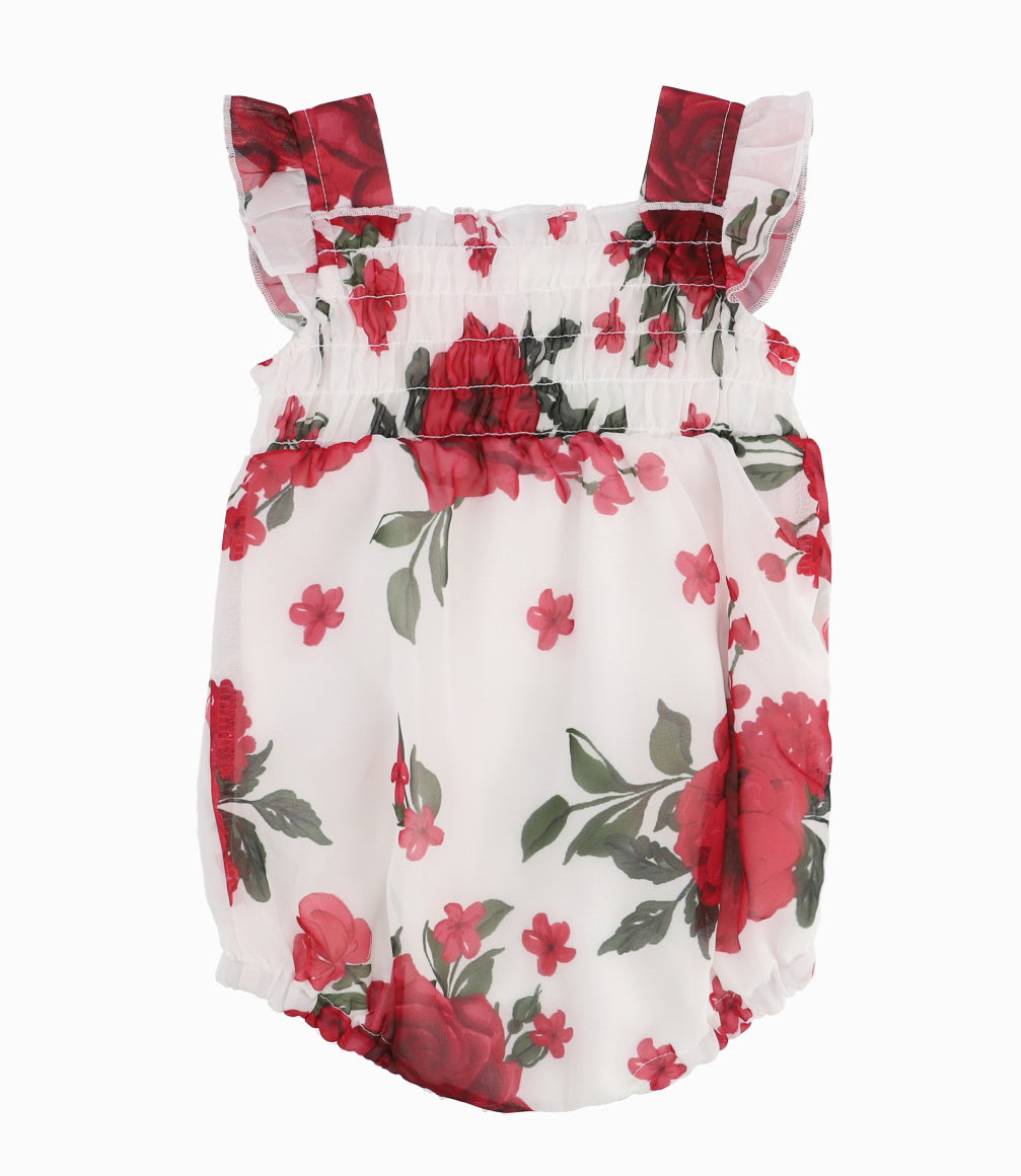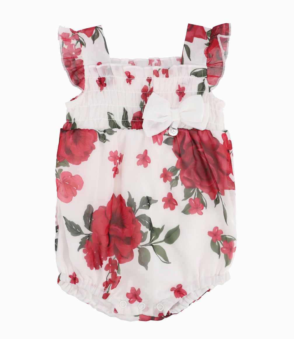 Enterito amplio con diseño floreado, vuelos en los hombros y lazo decorativo. Para mayor comodidad, la parte superior es elasticada.
