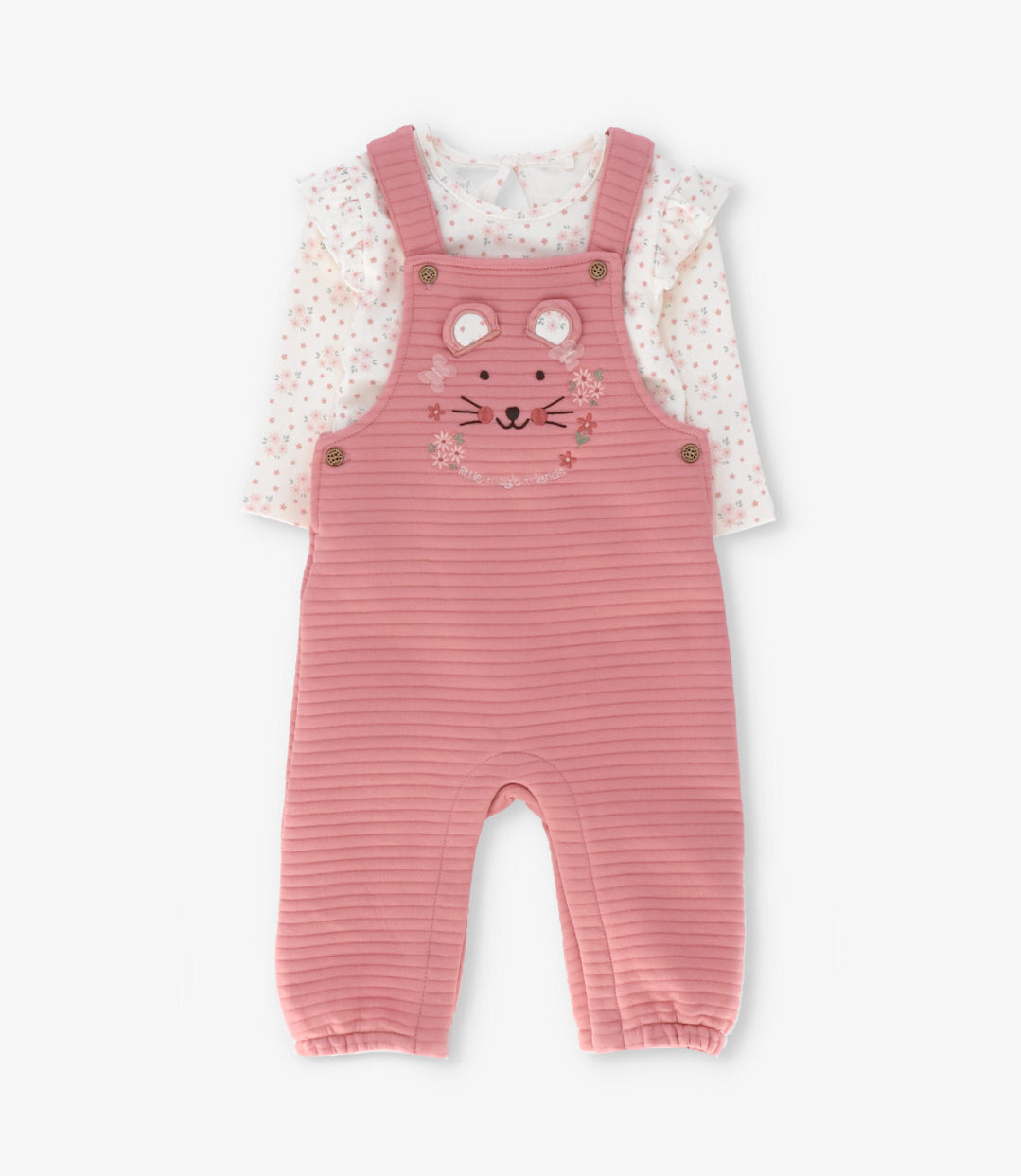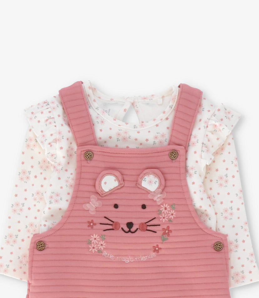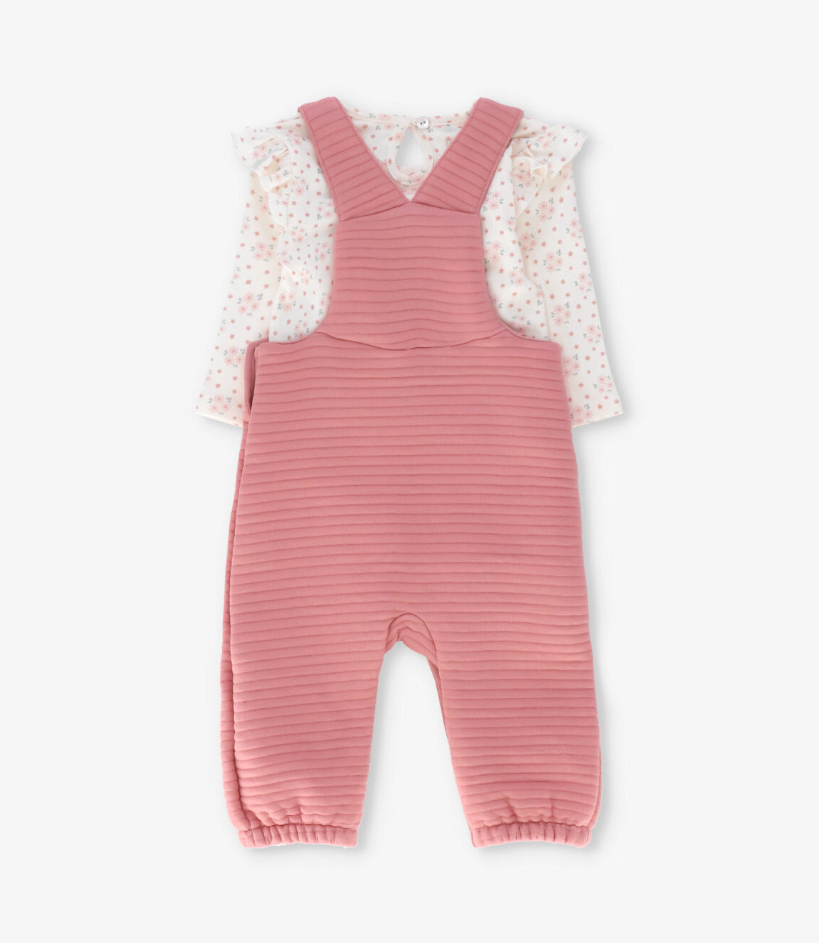 Esta jardinera con body para recién nacida está confeccionada en tela air jacquard con una composición de 60% algodón y 40% poliéster, pensada para acompañar sus movimientos con comodidad y ligereza.