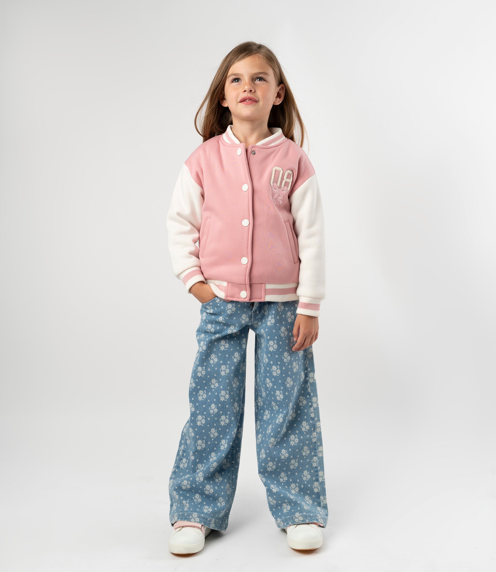 Estos jeans floreados para niña están confeccionados en tela denim con una composición de 98% algodón y 2% elastano, pensados para resistir juegos, saltos y toda la energía de cada día.