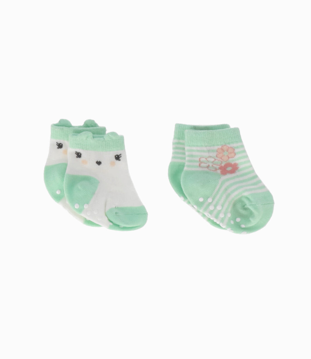 Pack de calcetines. Uno tiene orejas sobresalientes y otro es rayado con flores.