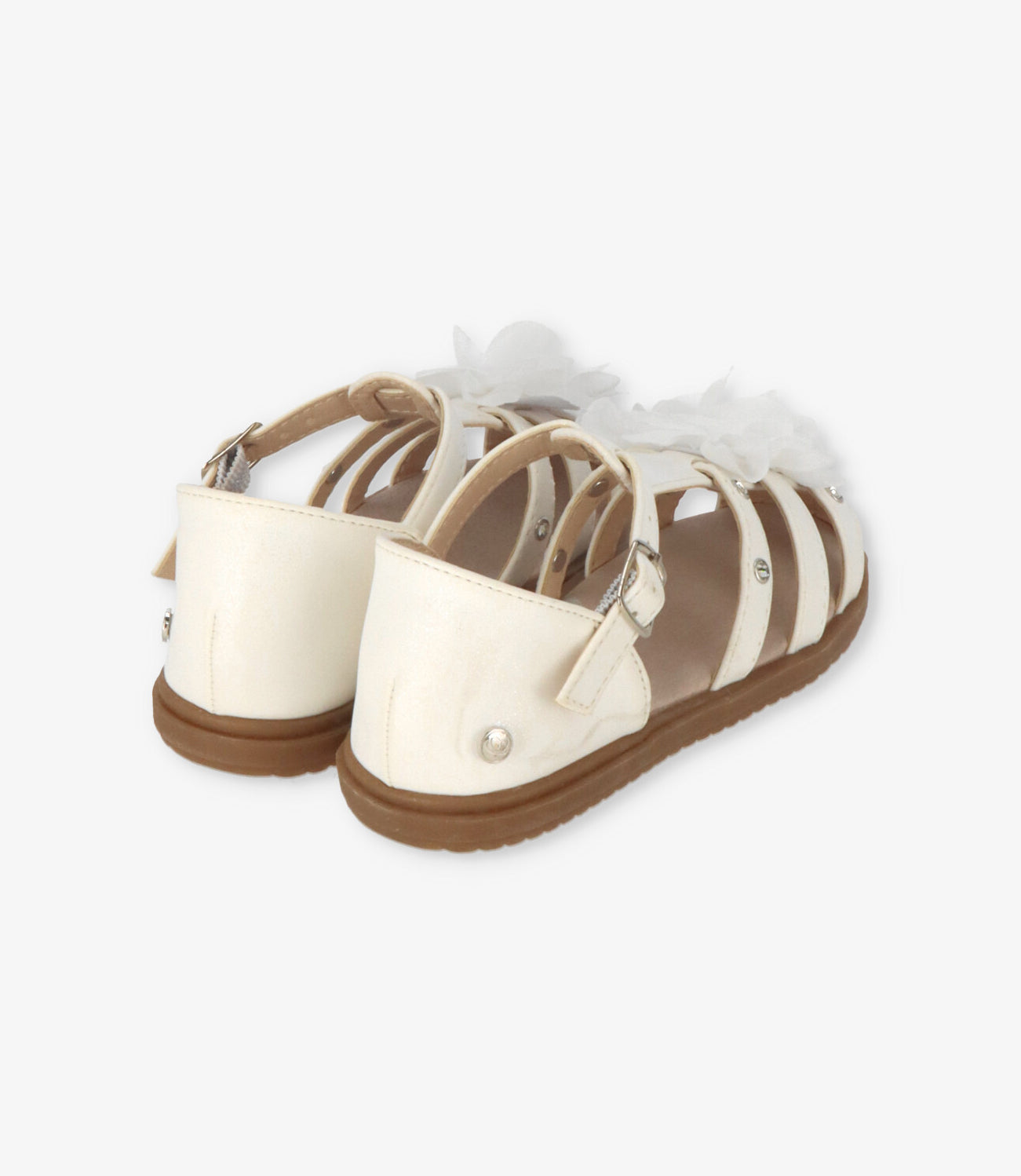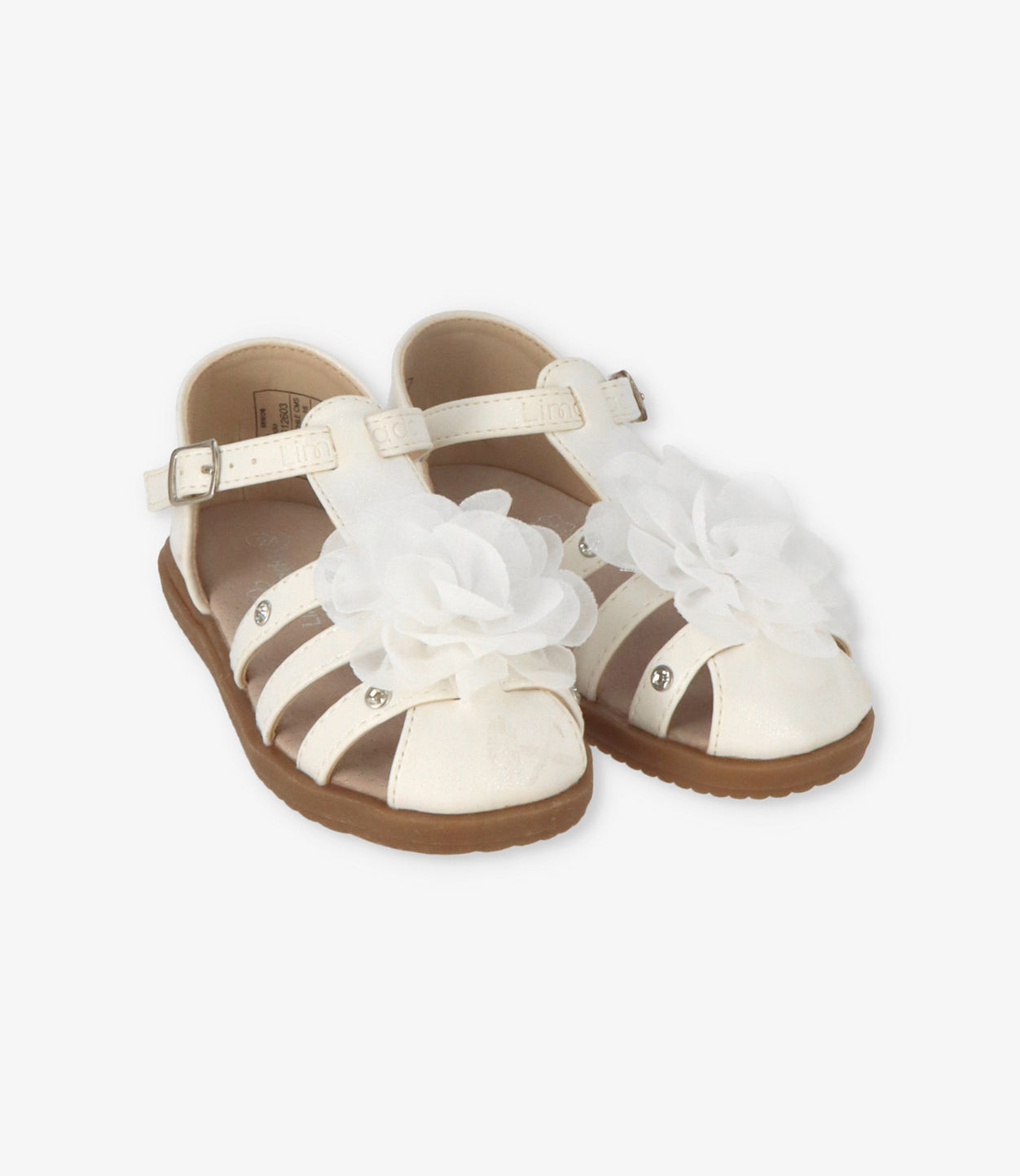 Sandalia blanca con talón cerrado. Flor textil decorativa en empeine. Ajuste con hebilla. Forro de canvas suave. Plantilla de cuero. Suela de TPR.