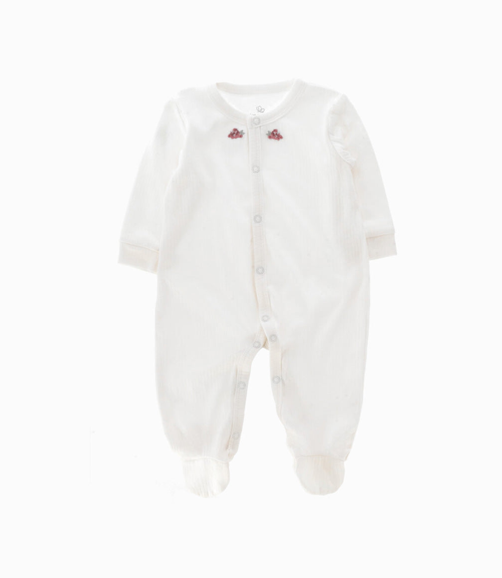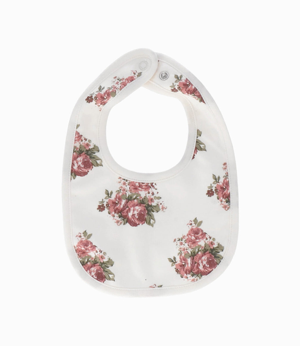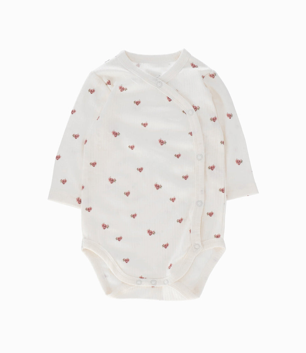Set general para recién nacida, incluye: un body acanalado con flores, enterito acanalado, babero floreado, botas y gorro con nudo.