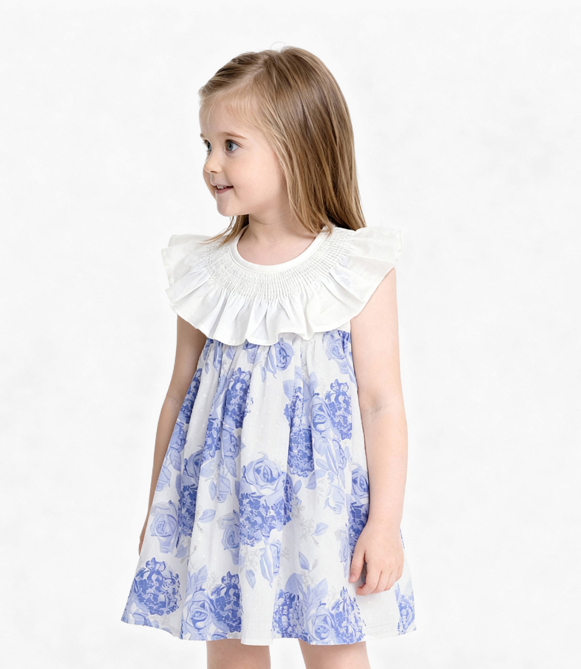 Vestido de caída amplia con diseño floreado, vuelos en el cuello y lazo en la espalda.