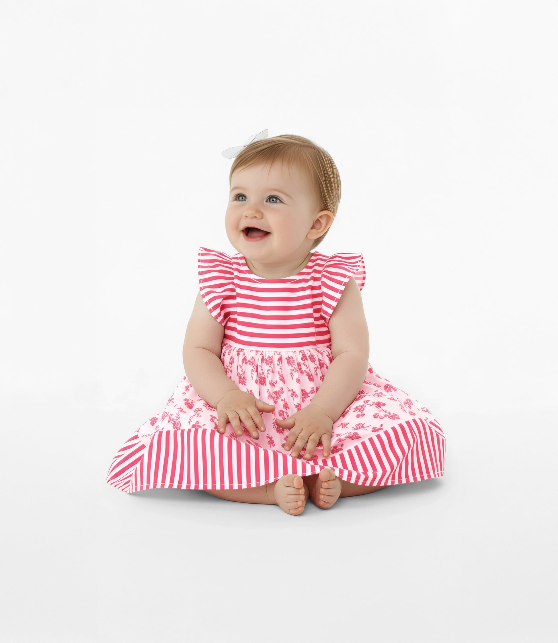 Vestido amplio para recién nacida con diseño de rayas y flores.