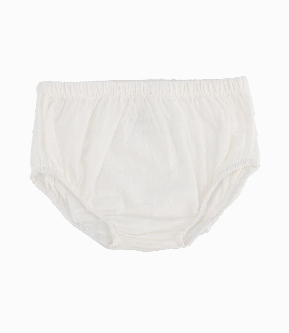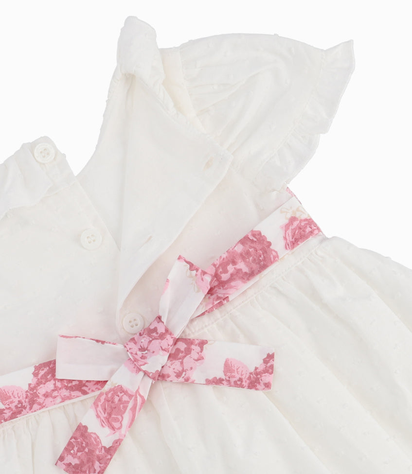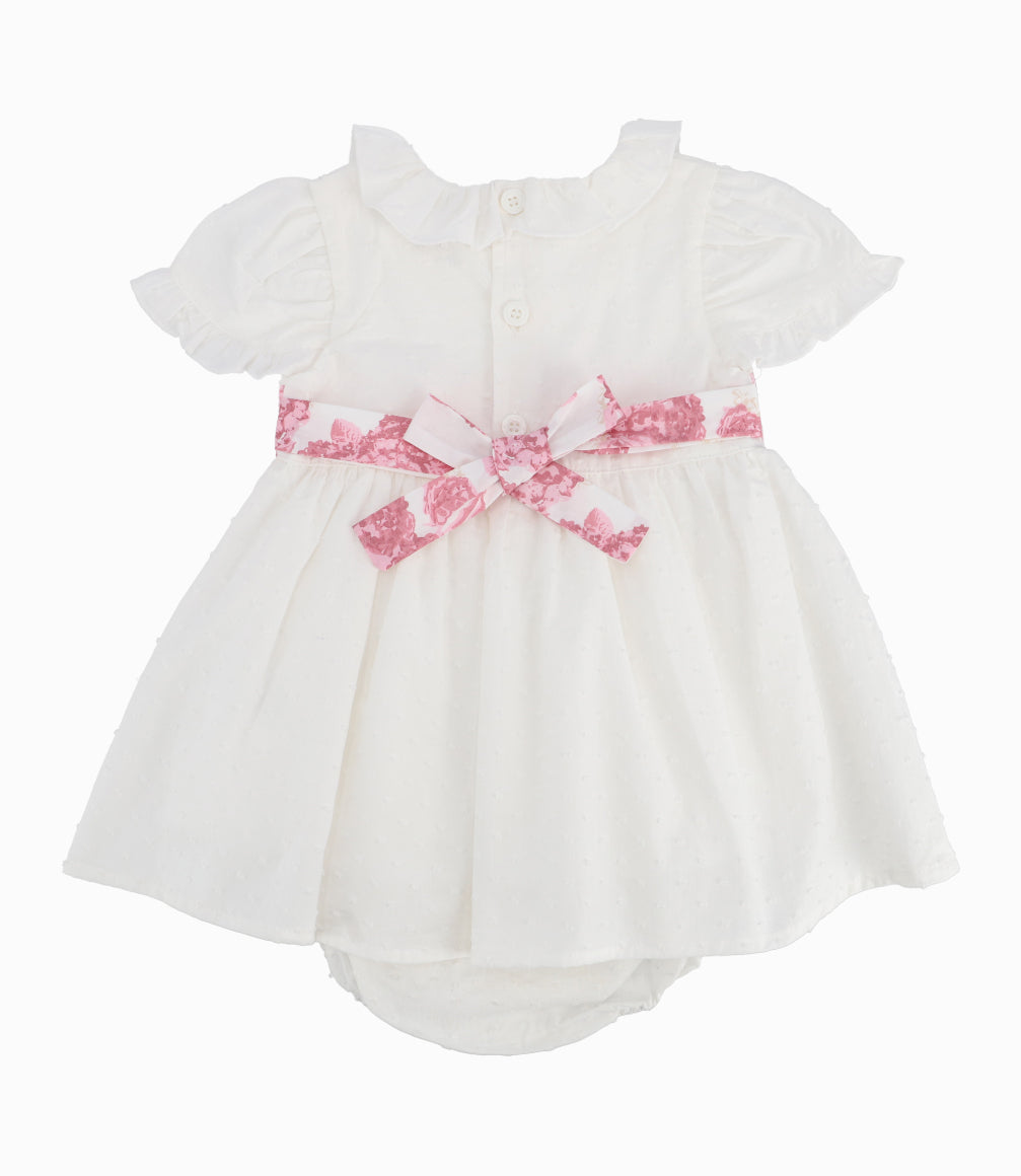 Vestido con puntos y cintura floreada con lazo en la espalda. Incluye calzón.