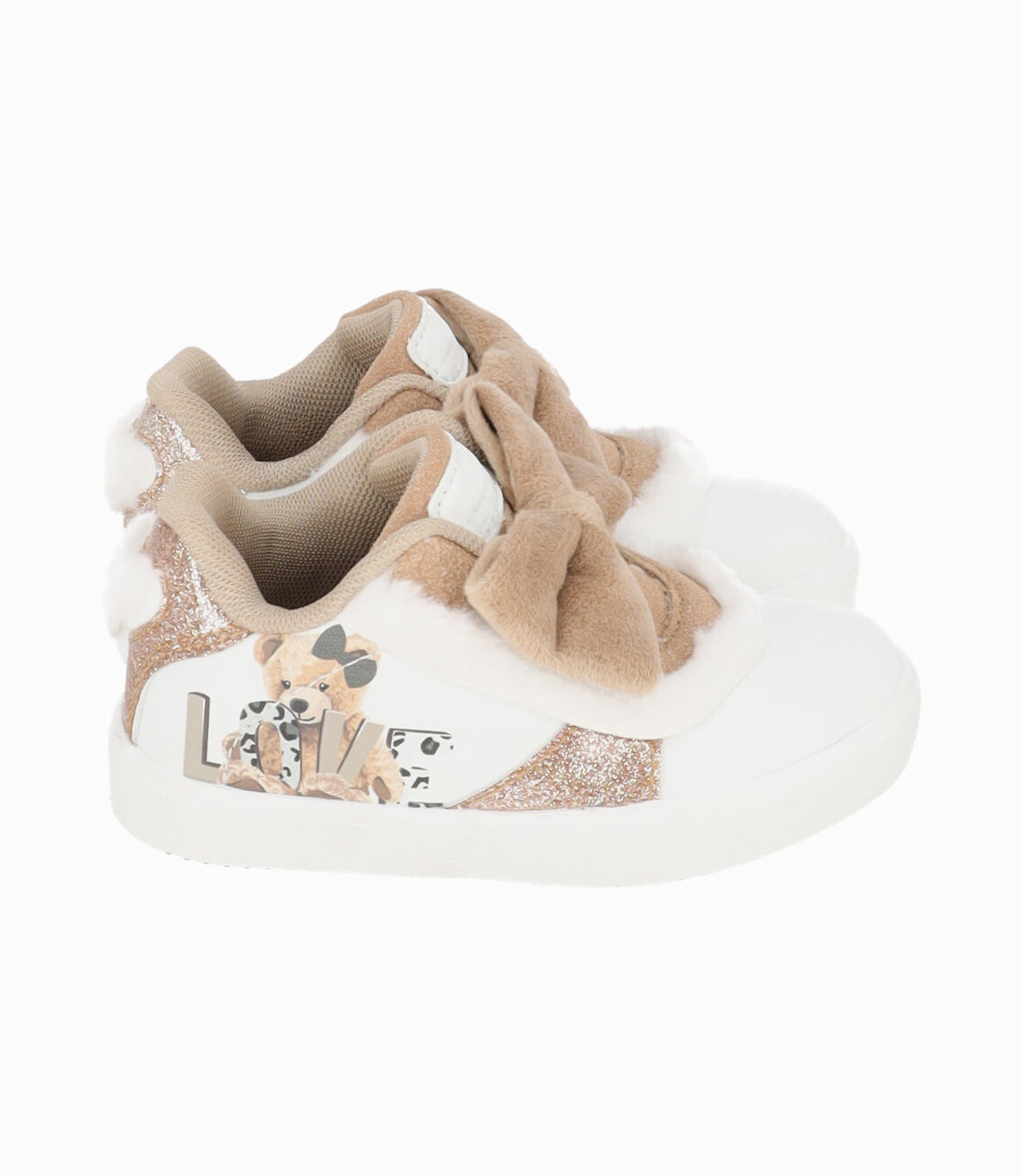 Zapatilla urbana blanca con detalles en beige con estampado de osito. Pieza de ojetillos decorada con material peludo en todo su borde. Moño de terciopelo sobre suplente. Ajuste con elástico interno. Forro de mesh. Plantilla de cuero. Puntera y talón reforzados. Suela de TPR flexible.